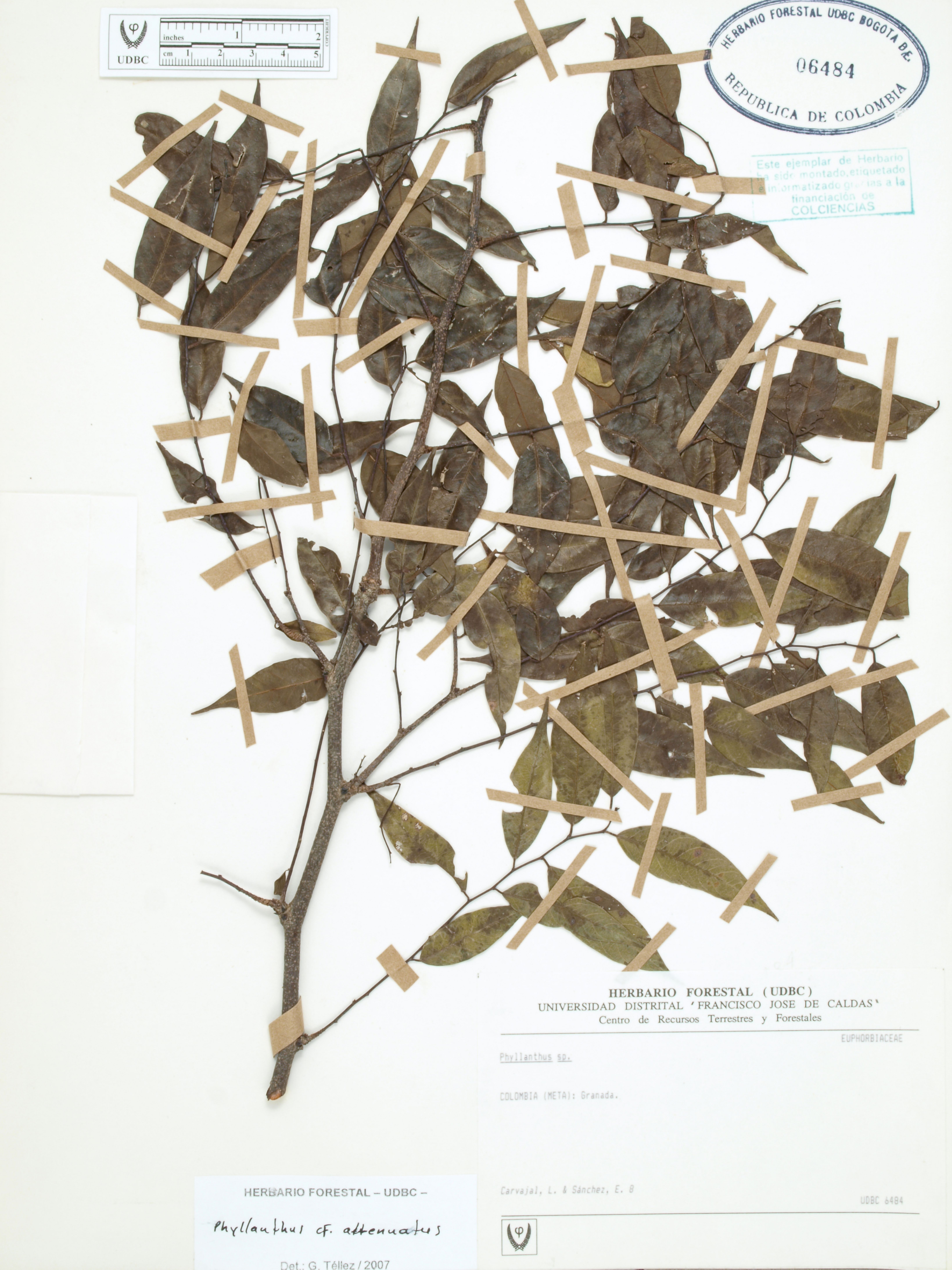 Fotografía del ejemplar Carvajal, L. 8, determinado como Phyllanthus attenuatus en el año 2007