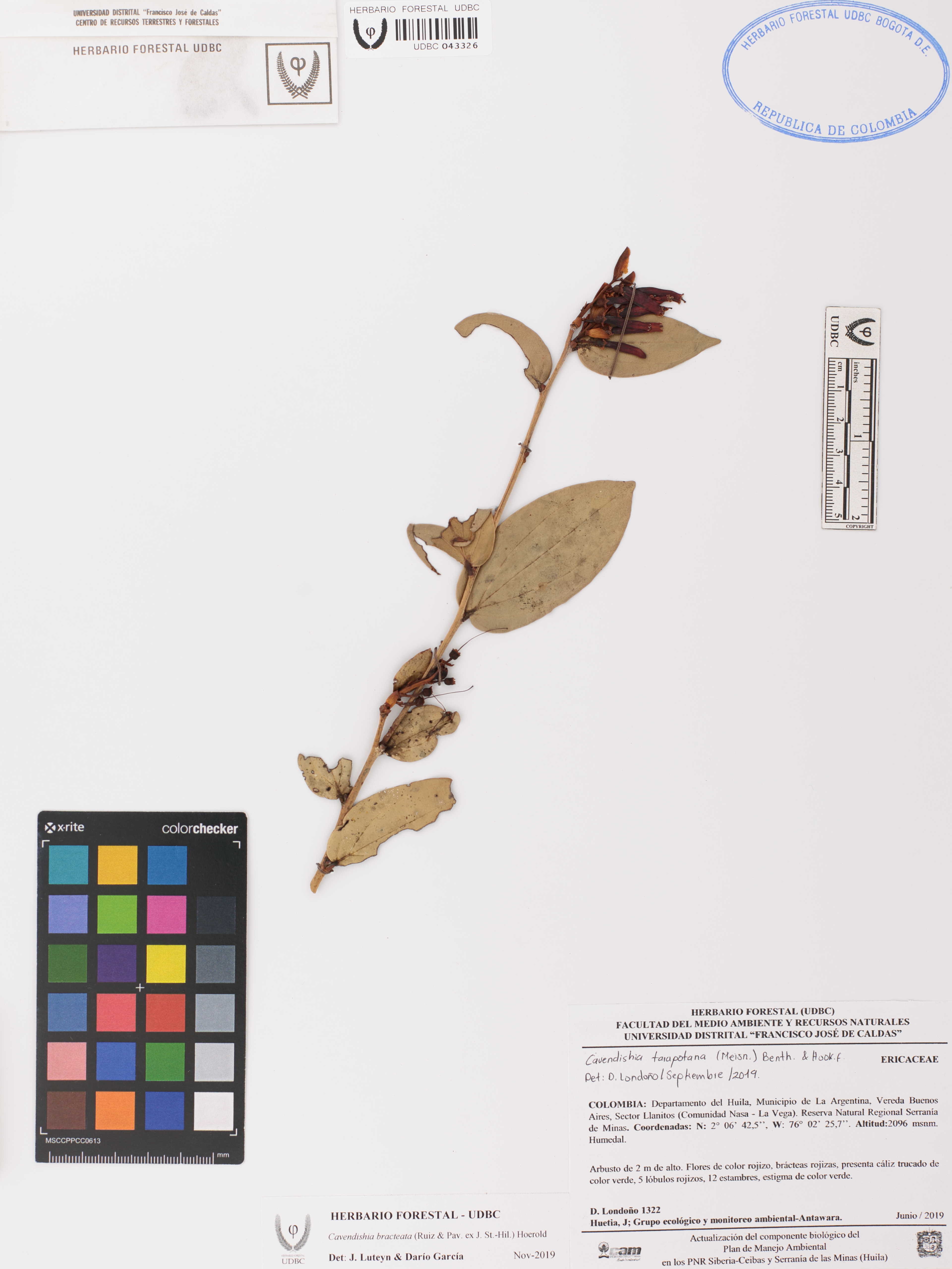 Fotografía del ejemplar Londoño, D. 1322, determinado como Cavendishia bracteata en el año 2019