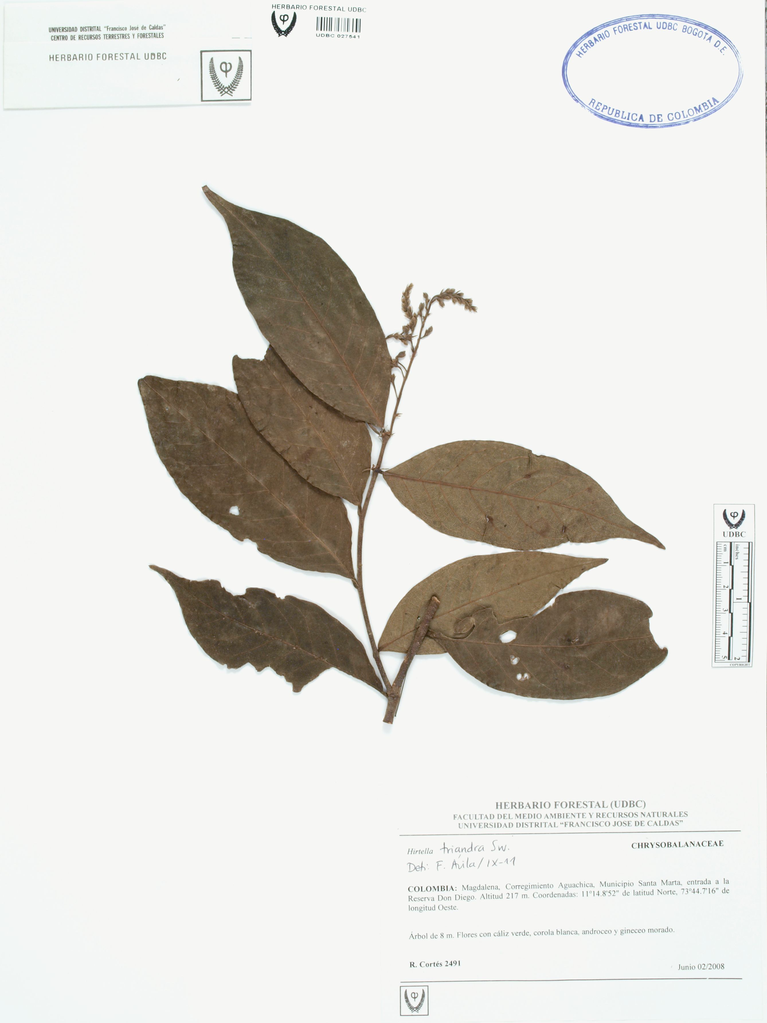 Fotografía del ejemplar Cortés-B., R. 2491, determinado como Hirtella triandra en el año 2011