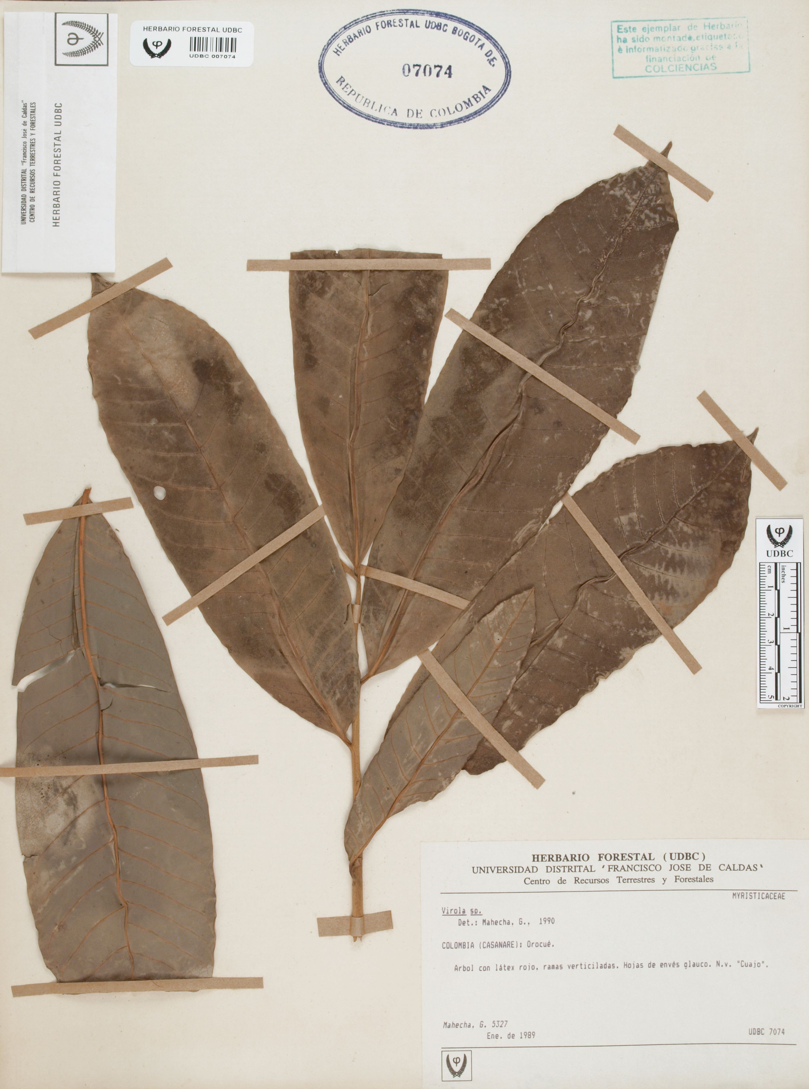 Fotografía del ejemplar Mahecha, G. 5327, determinado como Virola sp. en el año 1990