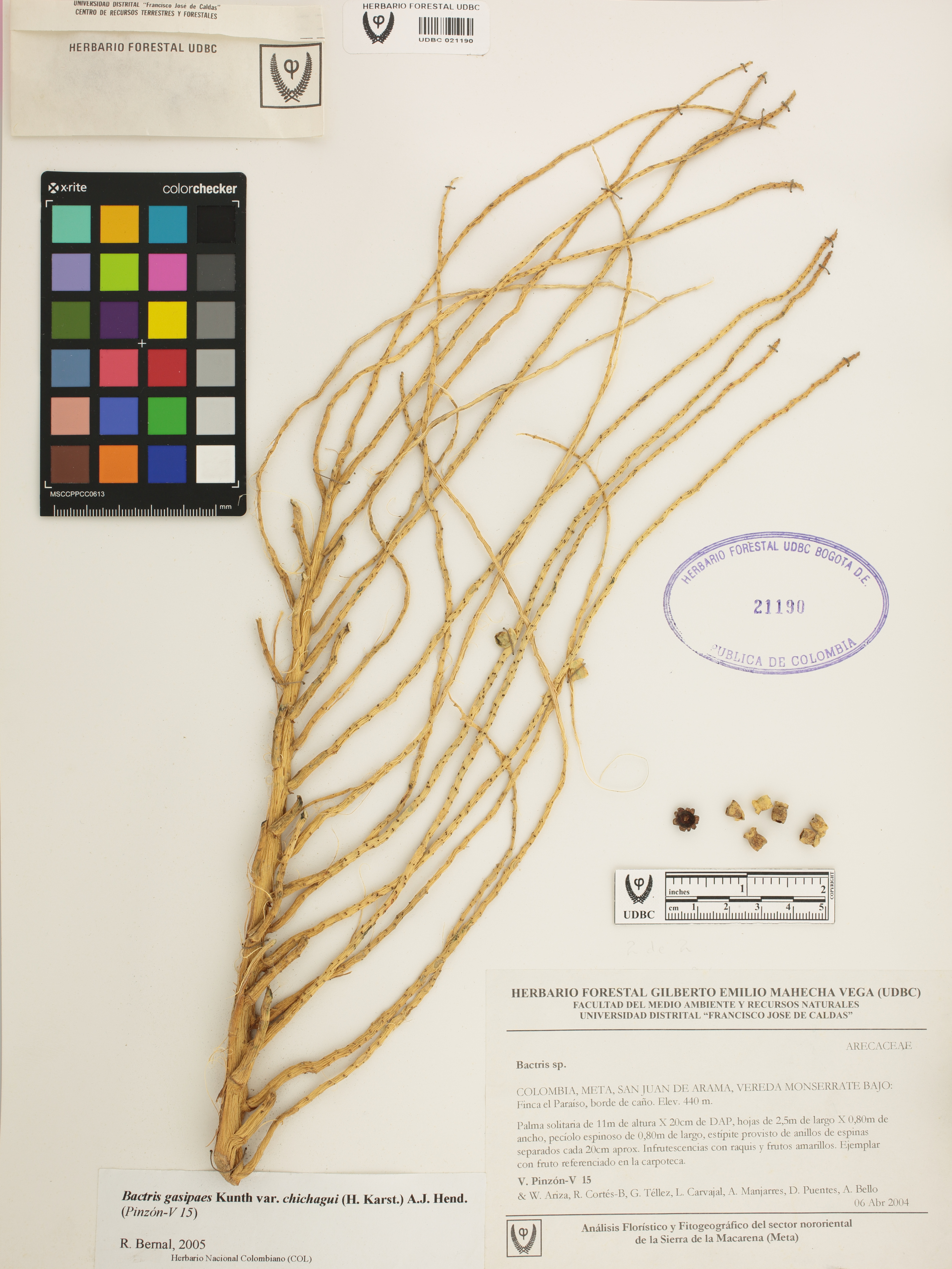 Fotografía del ejemplar Pinzón-V., V. 15, determinado como Bactris gasipaes var. chichagui en el año 2005