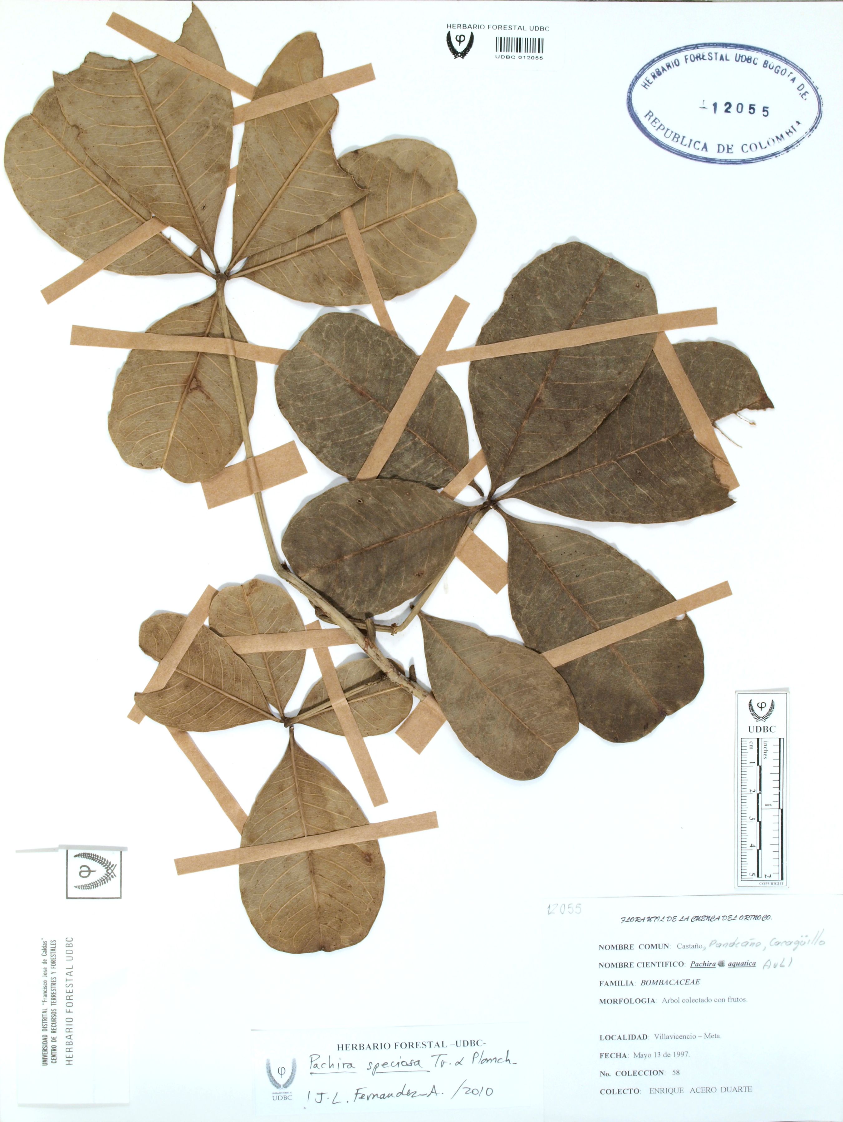 Fotografía del ejemplar Acero, E. 58, determinado como Pachira speciosa en el año 2010