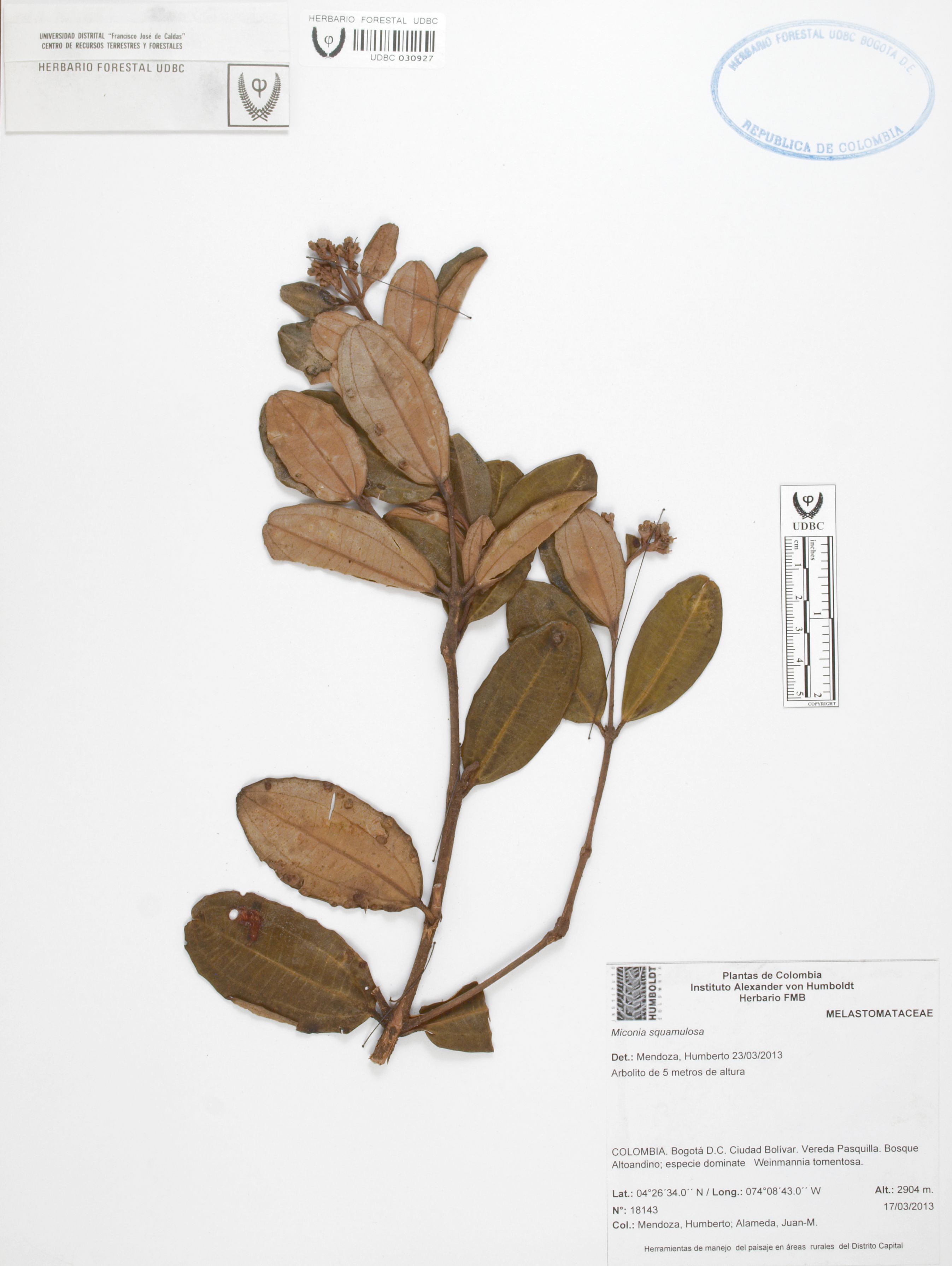 Fotografía del ejemplar Mendoza, H. 18143, determinado como Miconia squamulosa en el año 2013