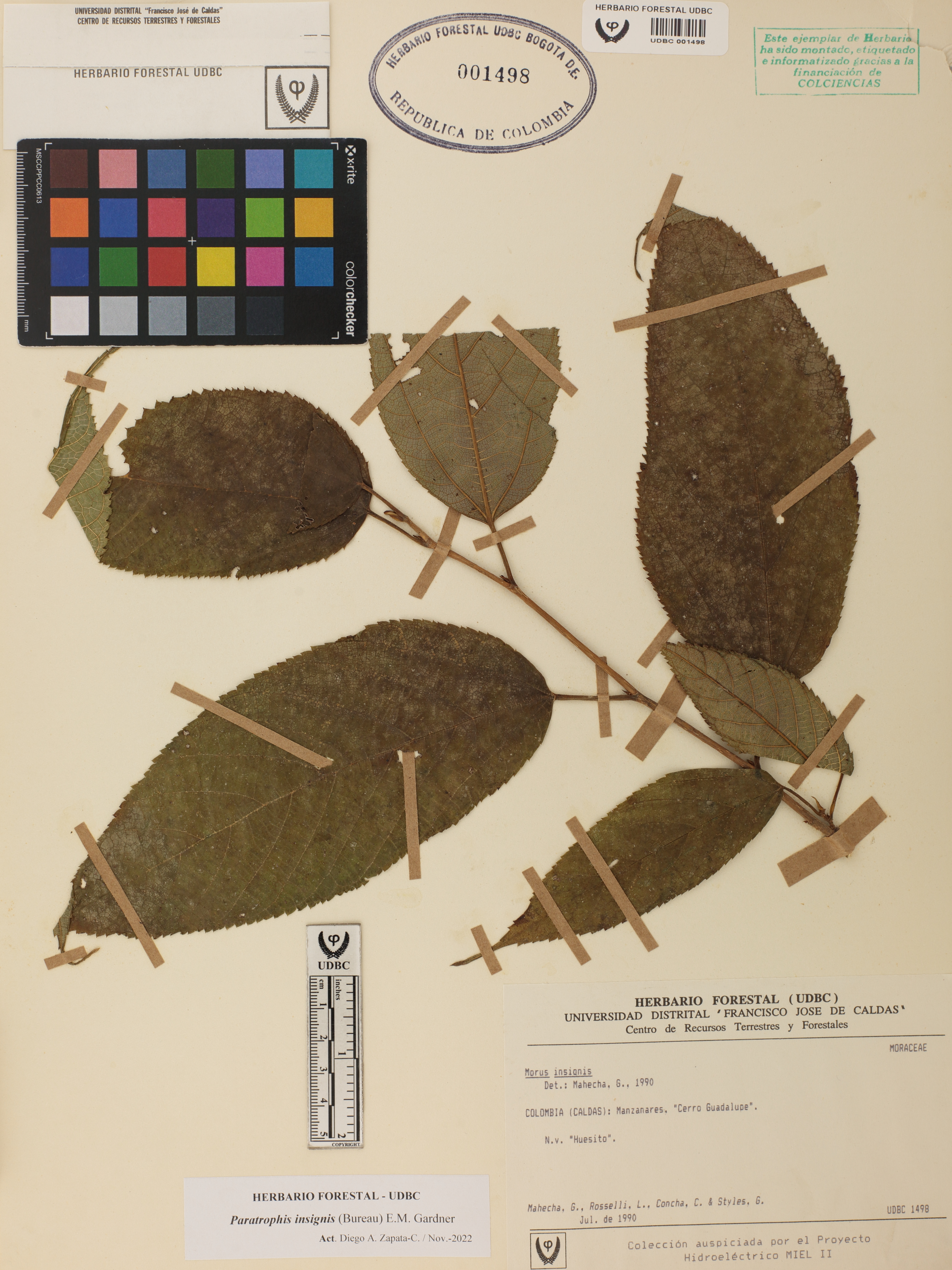Fotografía del ejemplar Mahecha, G., determinado como Paratrophis insignis en el año 1990