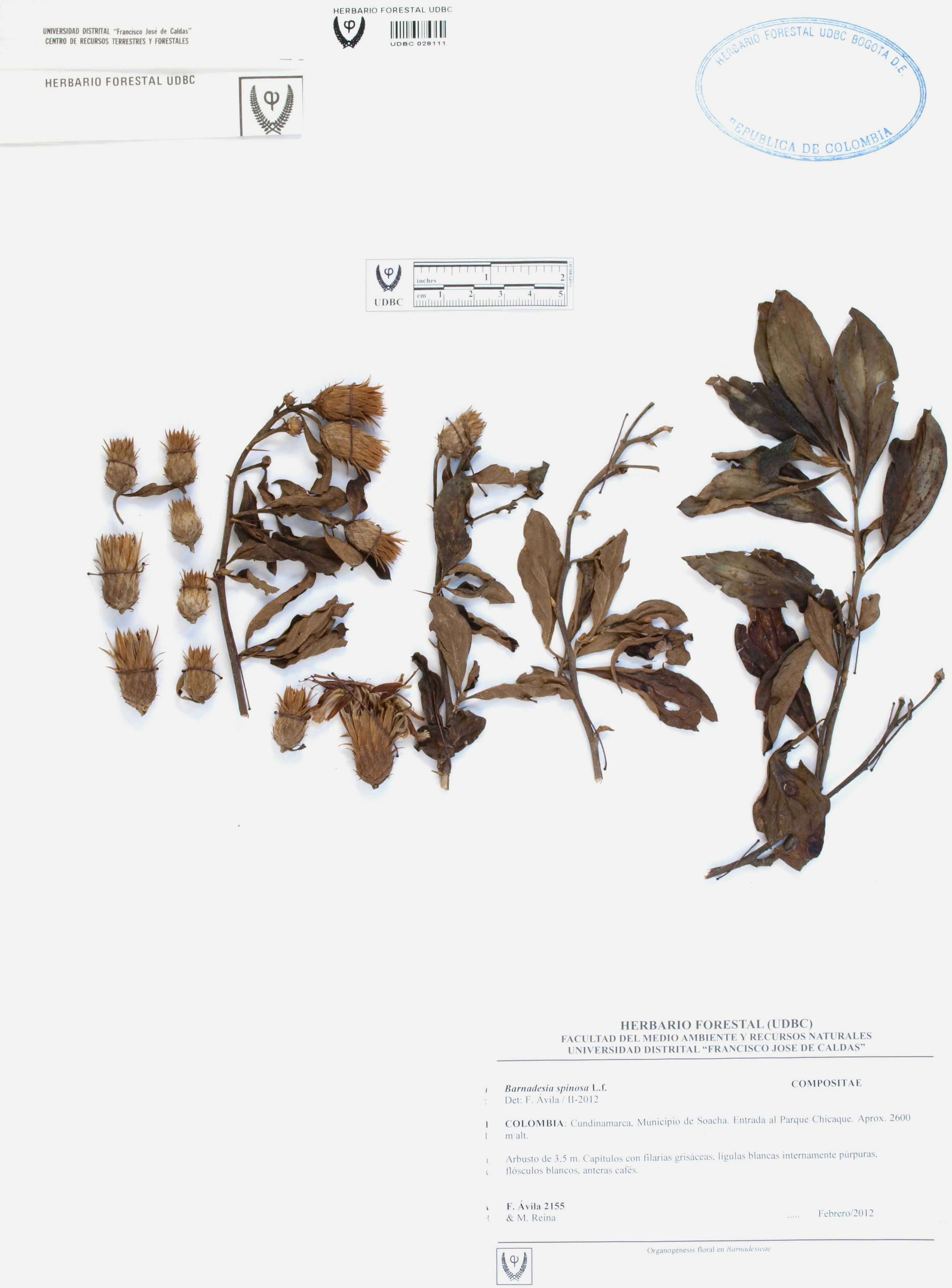 Fotografía del ejemplar Ávila, F. 2155, determinado como Barnadesia spinosa en el año 2012