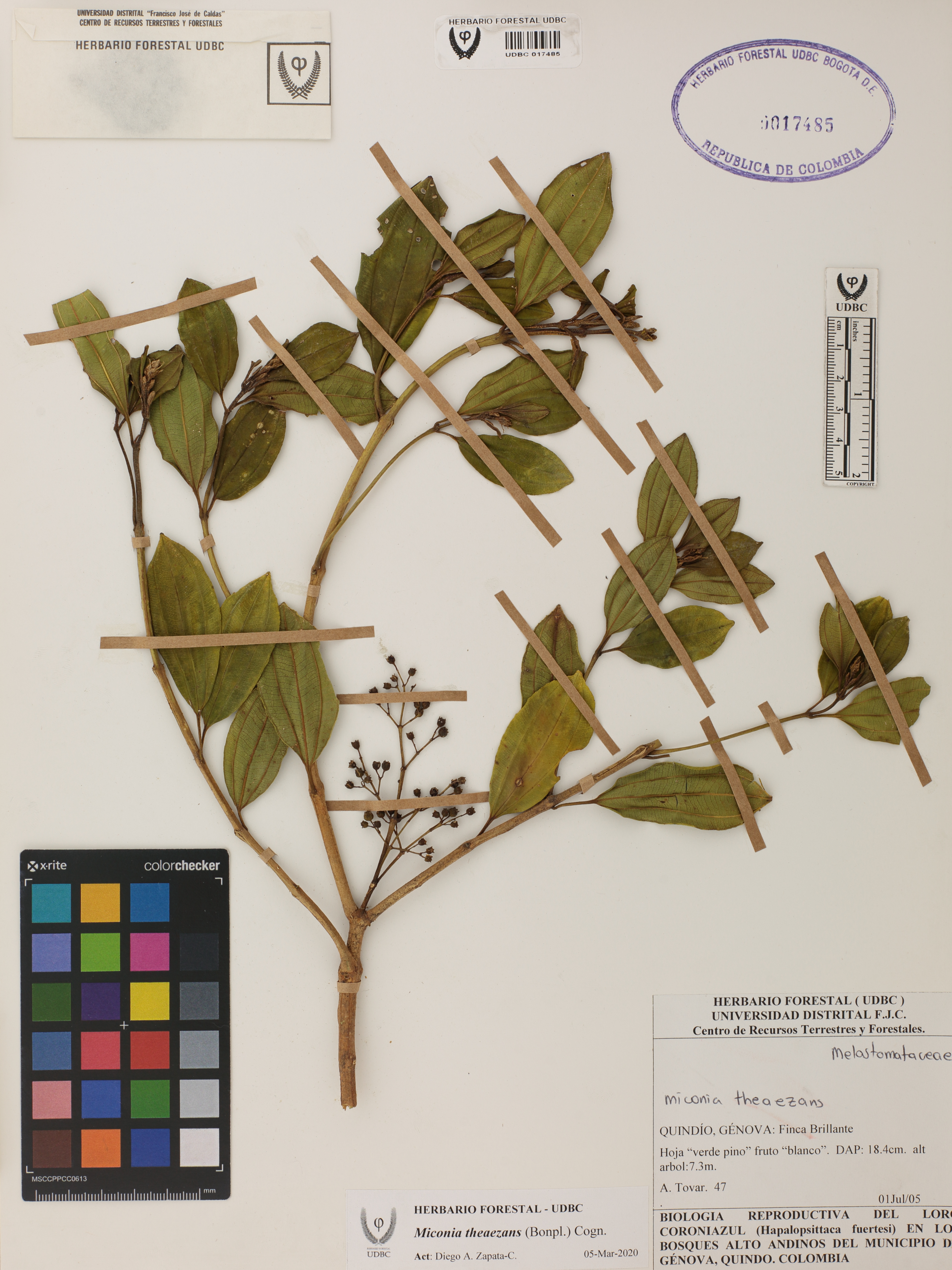 Fotografía del ejemplar Tovar, A. 47, determinado como Miconia theaezans en el año 2005