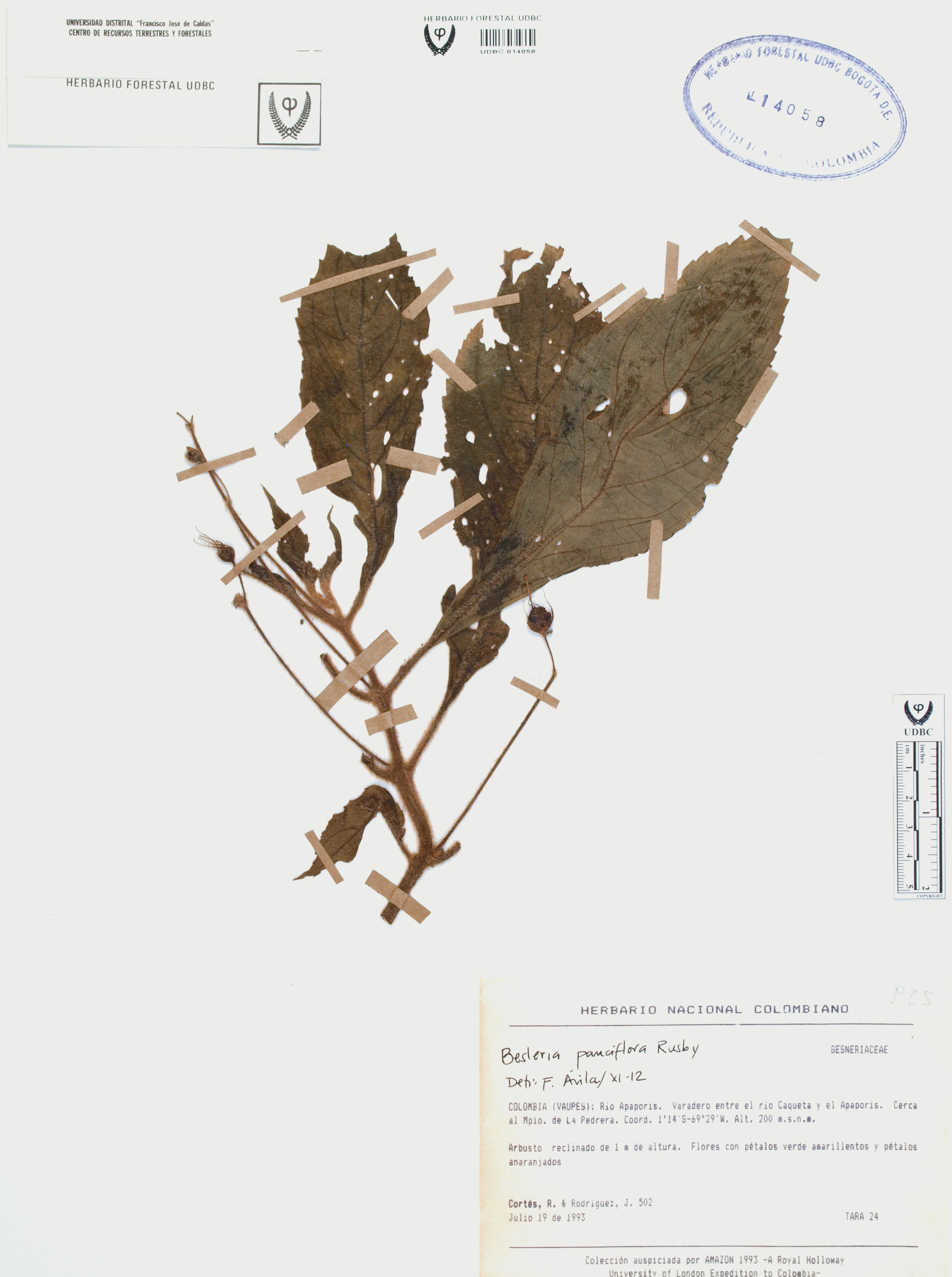 Fotografía del ejemplar Cortés-B., R. 502, determinado como Besleria pauciflora en el año 2012
