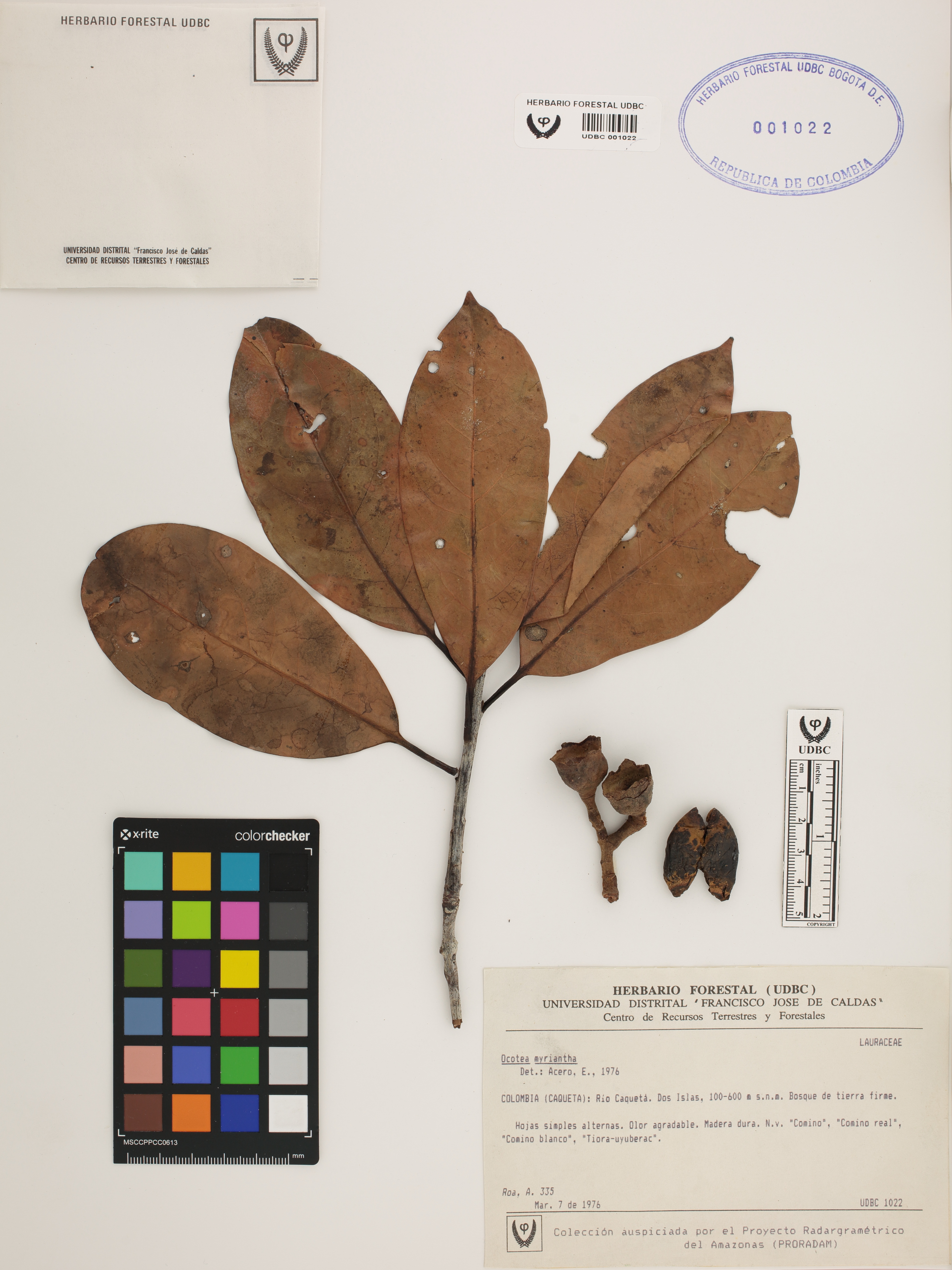 Fotografía del ejemplar Roa, A. 335, determinado como Ocotea myriantha en el año 1976