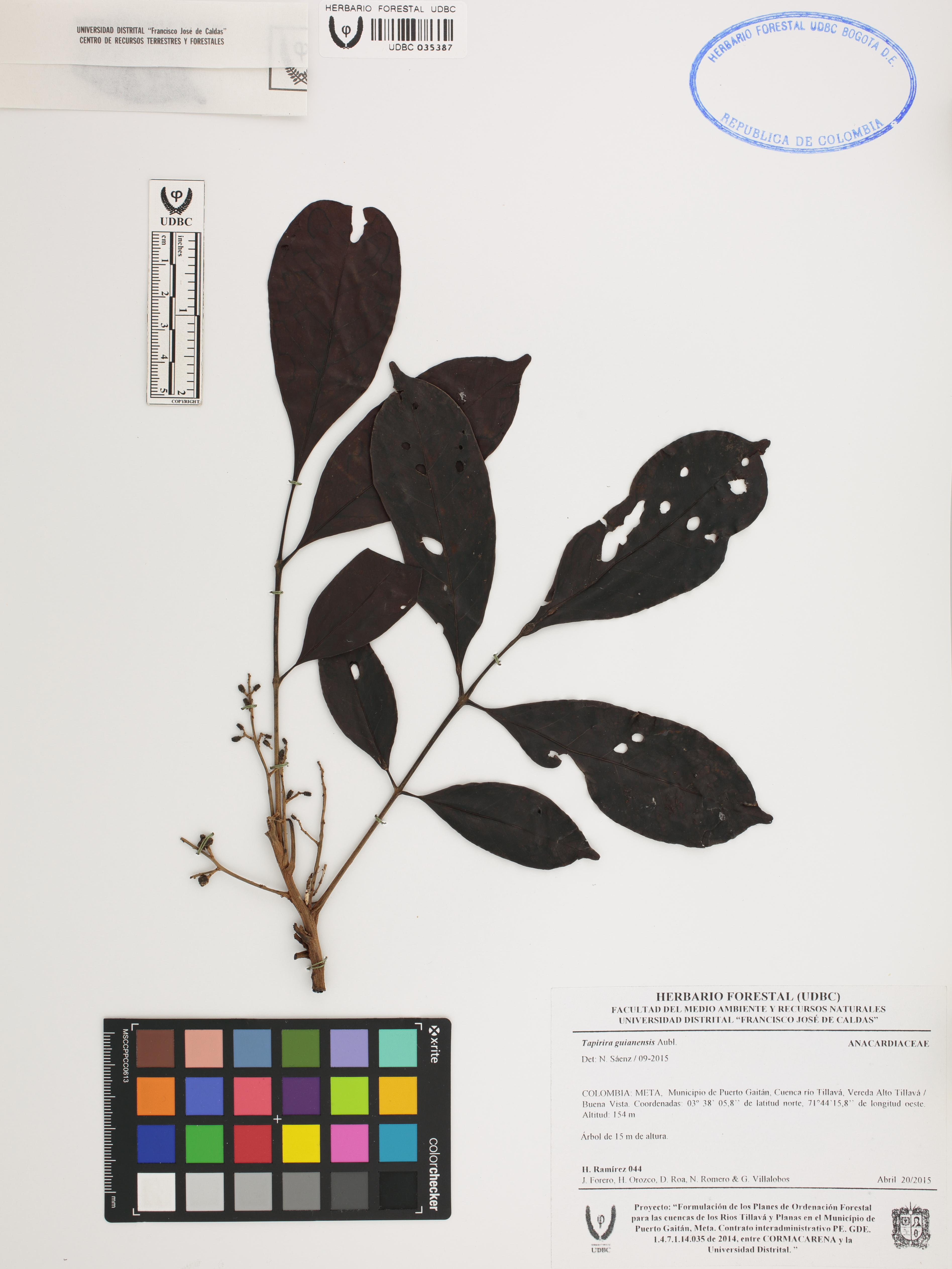 Fotografía del ejemplar Ramírez, H. 44, determinado como Tapirira guianensis en el año 2015