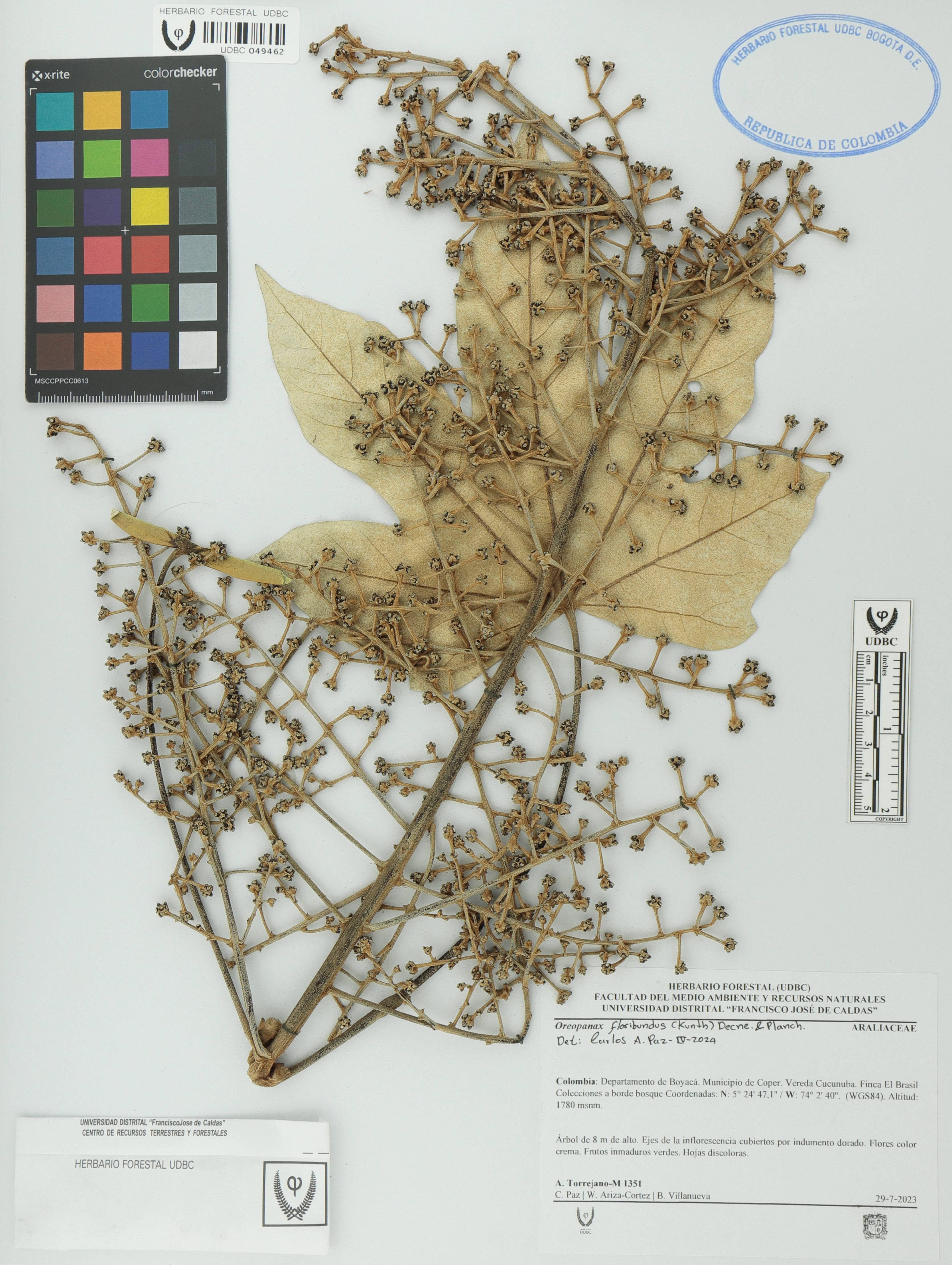 Fotografía del ejemplar Torrejano-M., A. 1351, determinado como Oreopanax floribundus en el año 2024