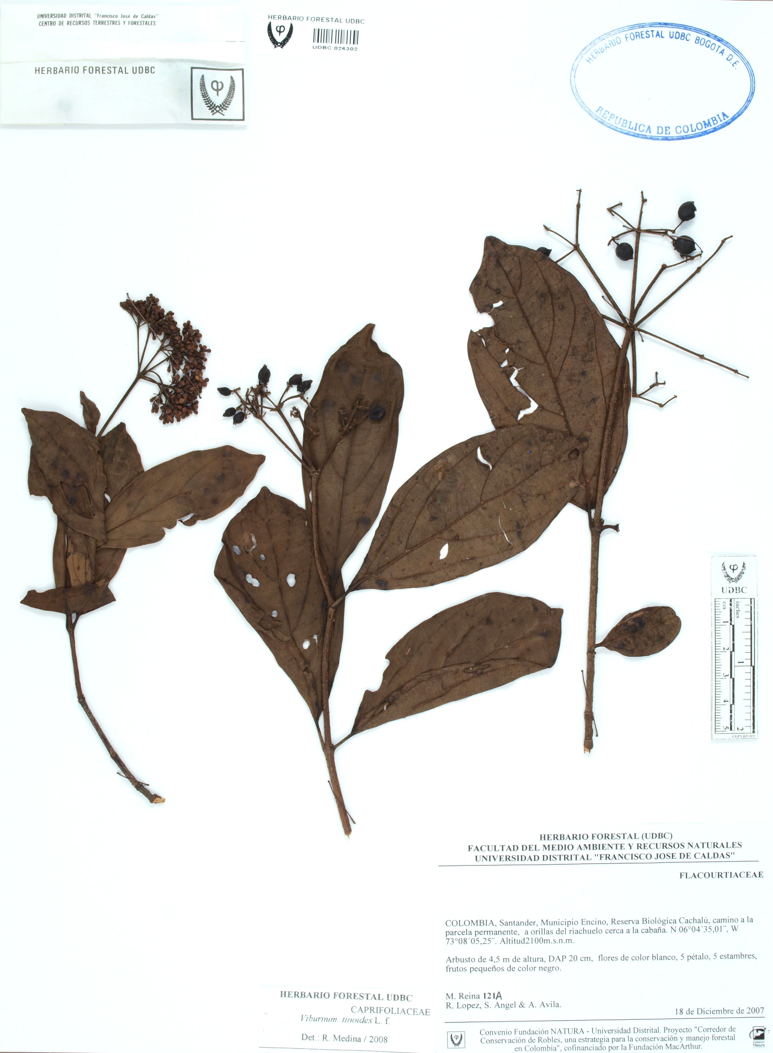 Fotografía del ejemplar Reina, M. 121, determinado como Viburnum tinoides en el año 2008