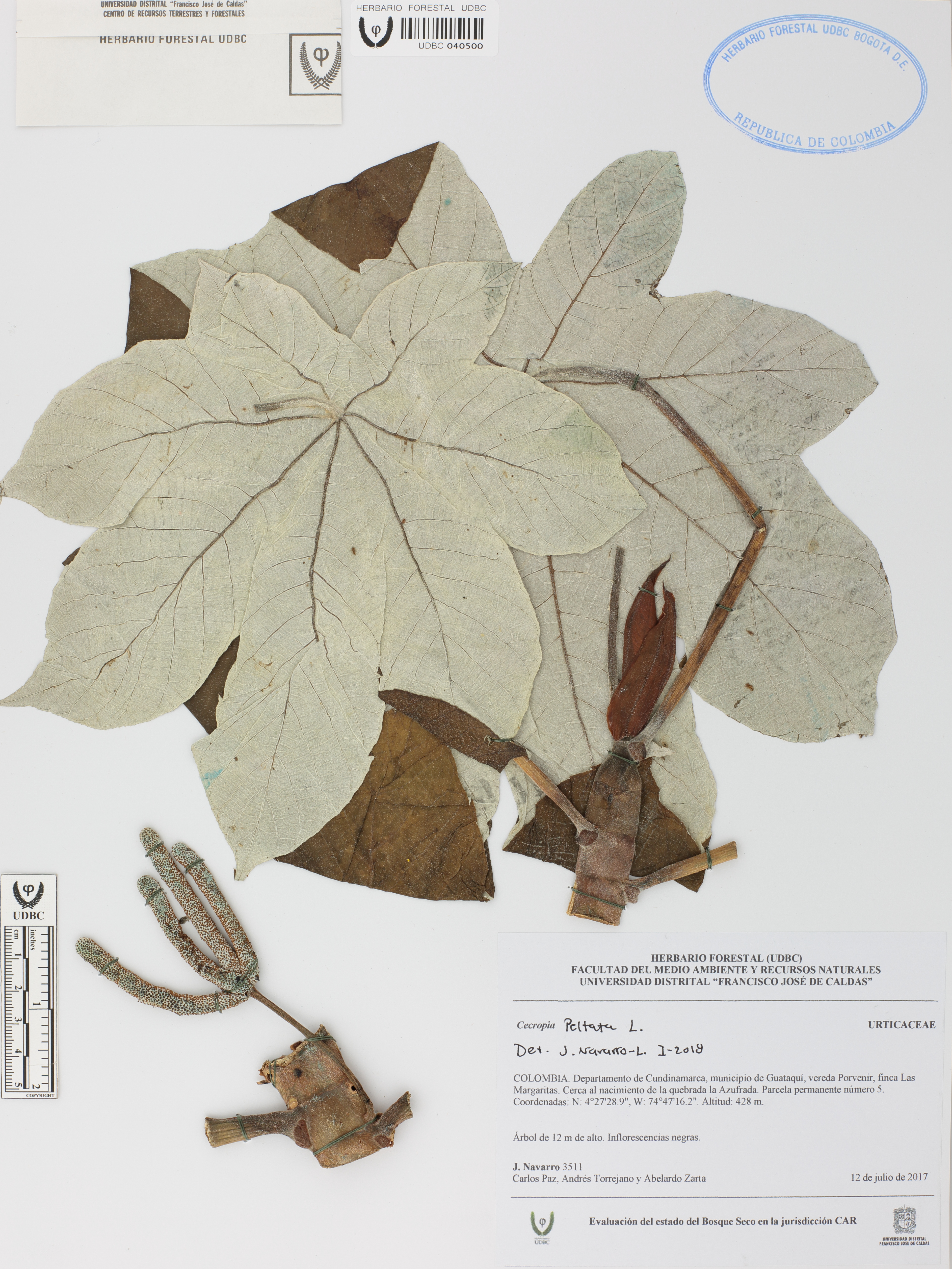 Fotografía del ejemplar Navarro, J. 3511, determinado como Cecropia peltata en el año 2018