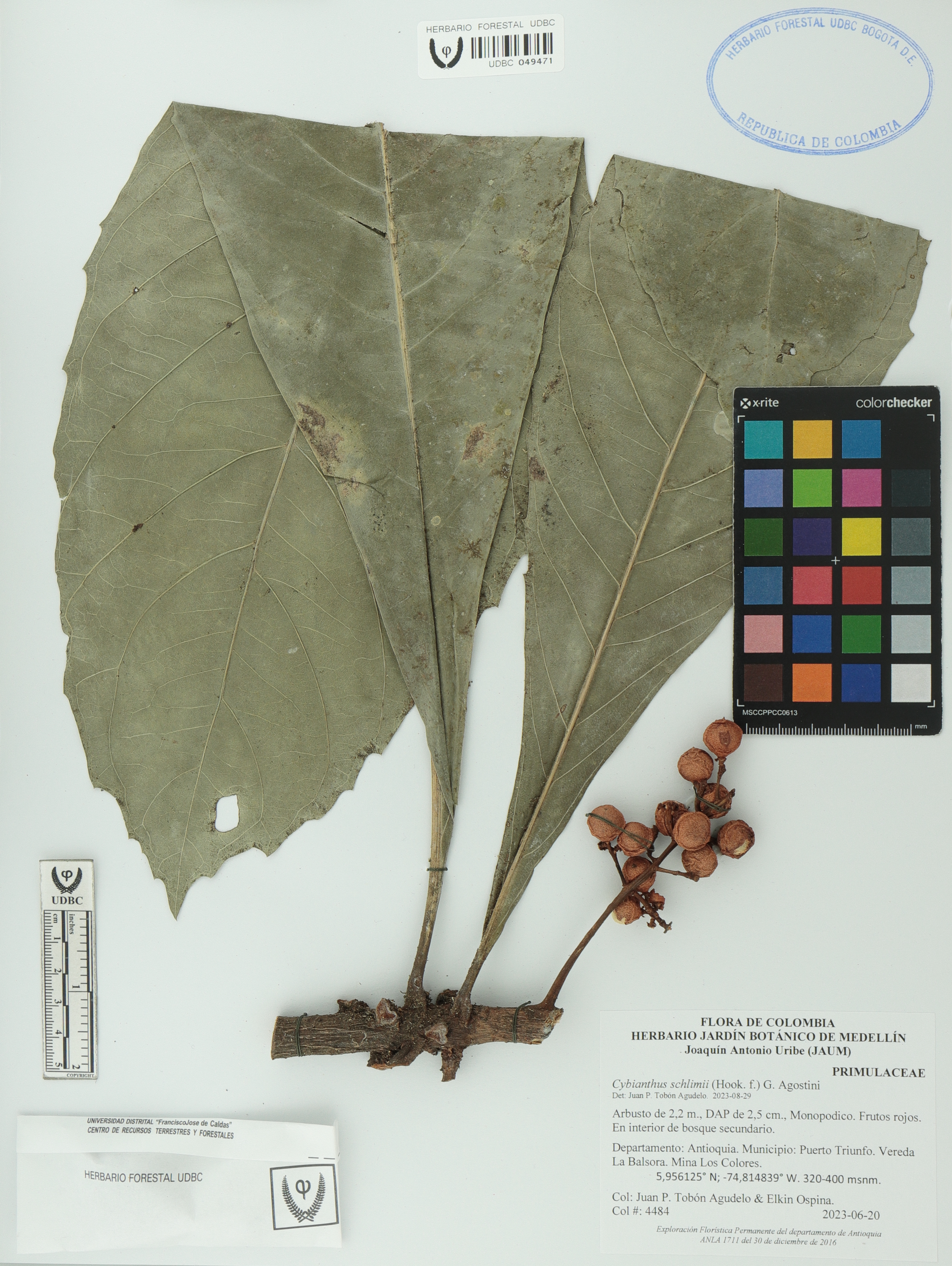 Fotografía del ejemplar Tobón-A., J. 4484, determinado como Cybianthus schlimii en el año 2023