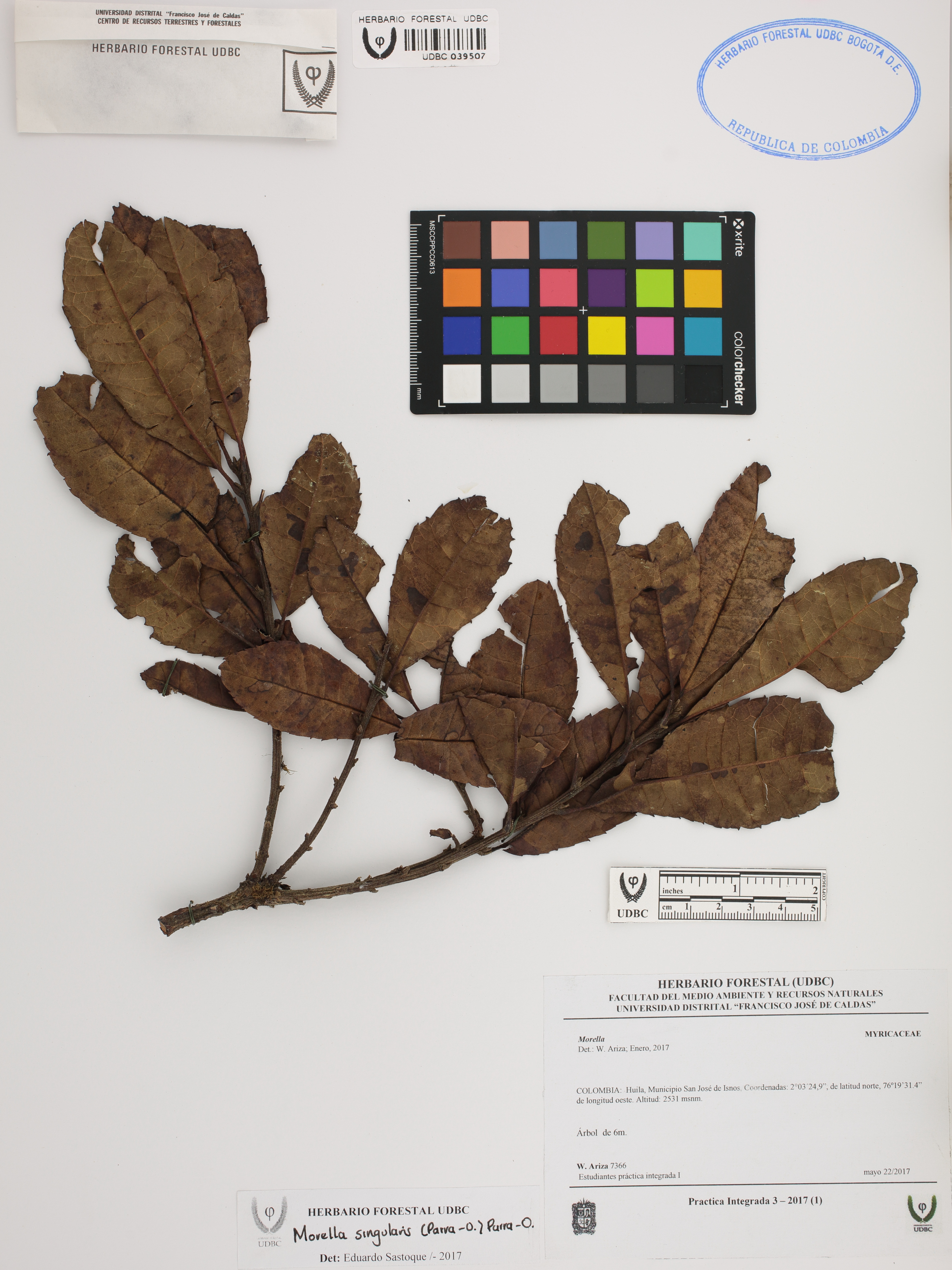 Fotografía del ejemplar Ariza, W. 7366, determinado como Morella singularis en el año 2017