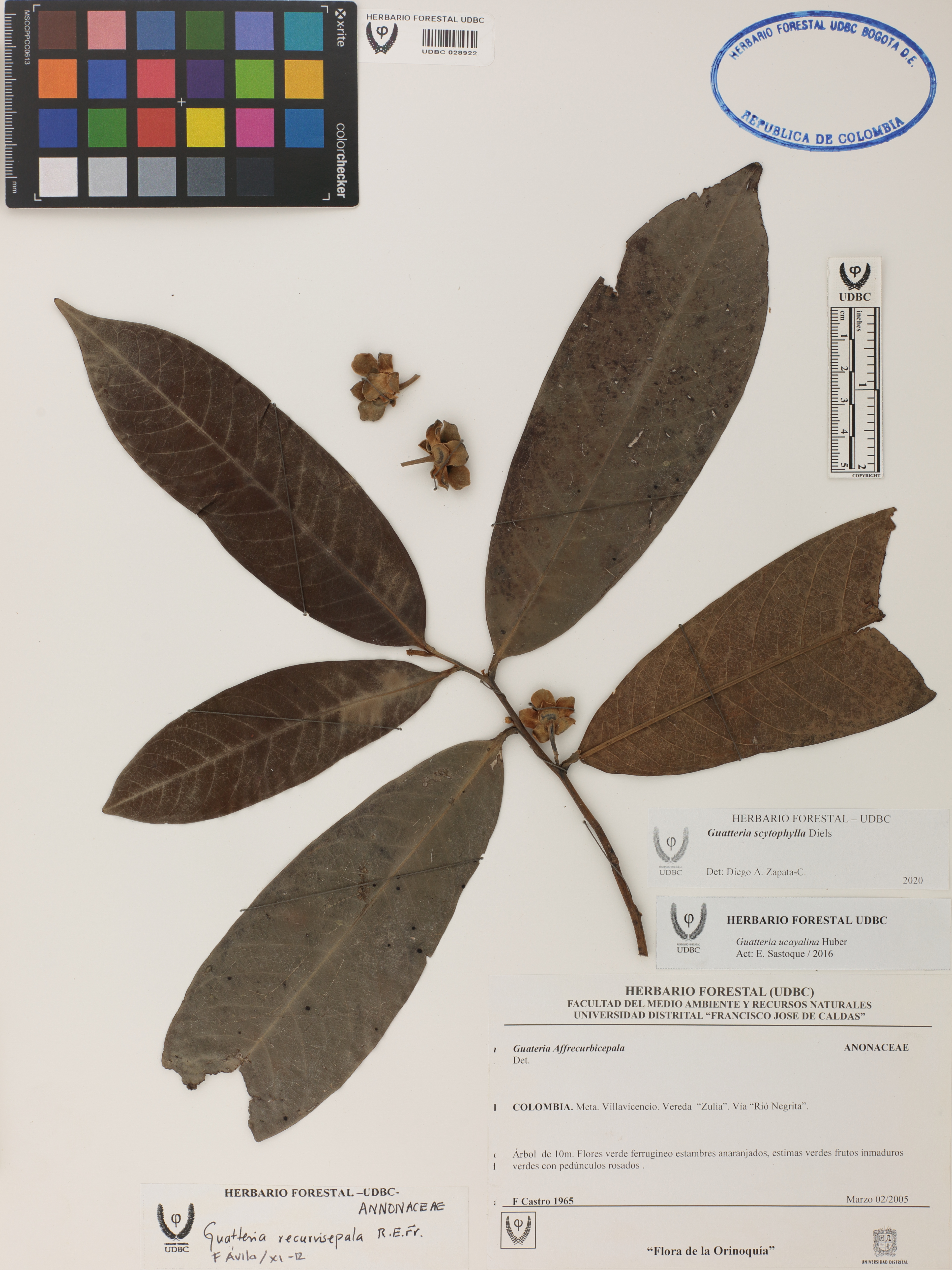 Fotografía del ejemplar Castro, F. 1965, determinado como Guatteria scytophylla en el año 2020