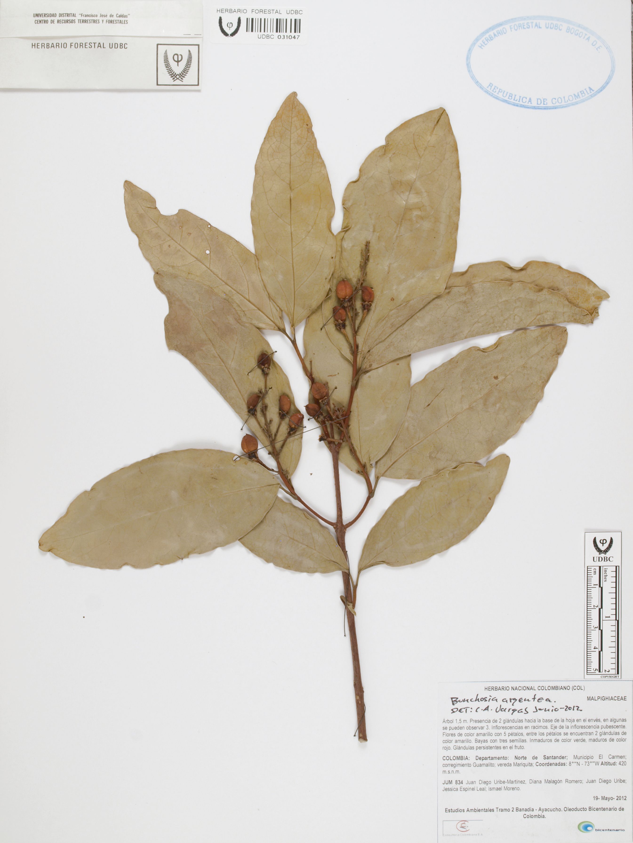 Fotografía del ejemplar Uribe-M., J. 834, determinado como Bunchosia argentea en el año 2012