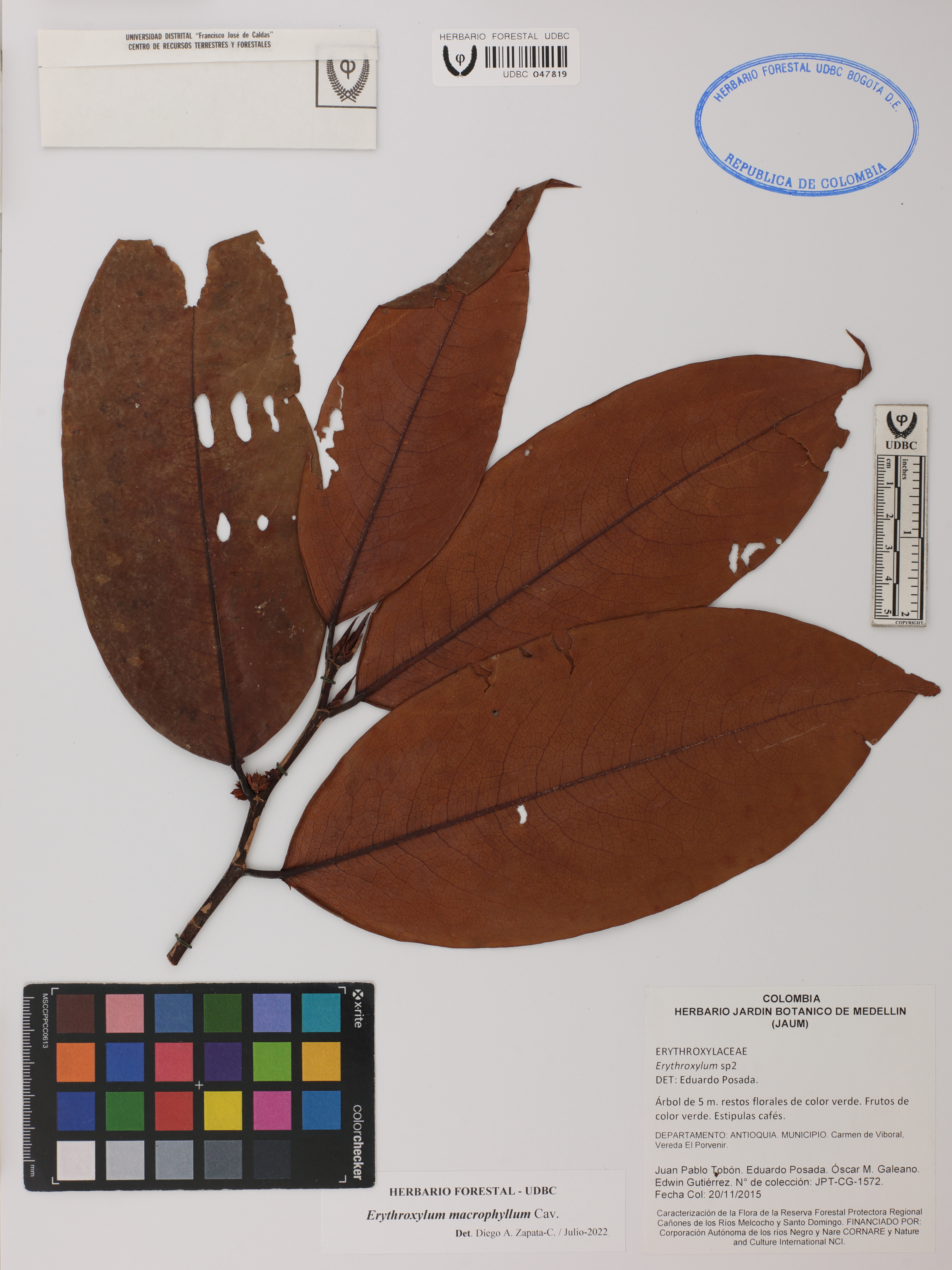 Fotografía del ejemplar Tobón-Agudelo, J. 1572, determinado como Erythroxylum macrophyllum en el año 2022