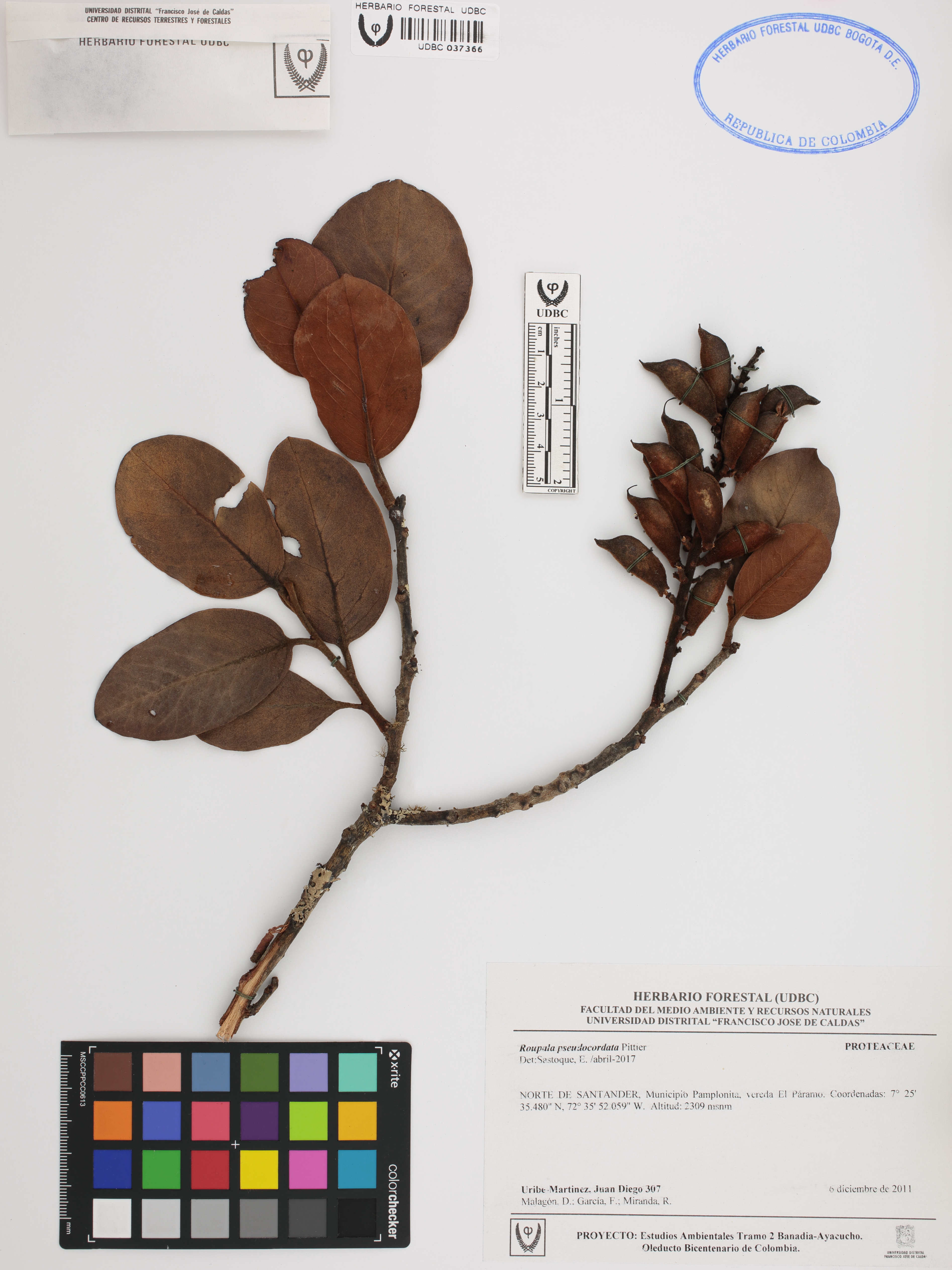 Fotografía del ejemplar Uribe-M., J. 307, determinado como Roupala pseudocordata en el año 2017
