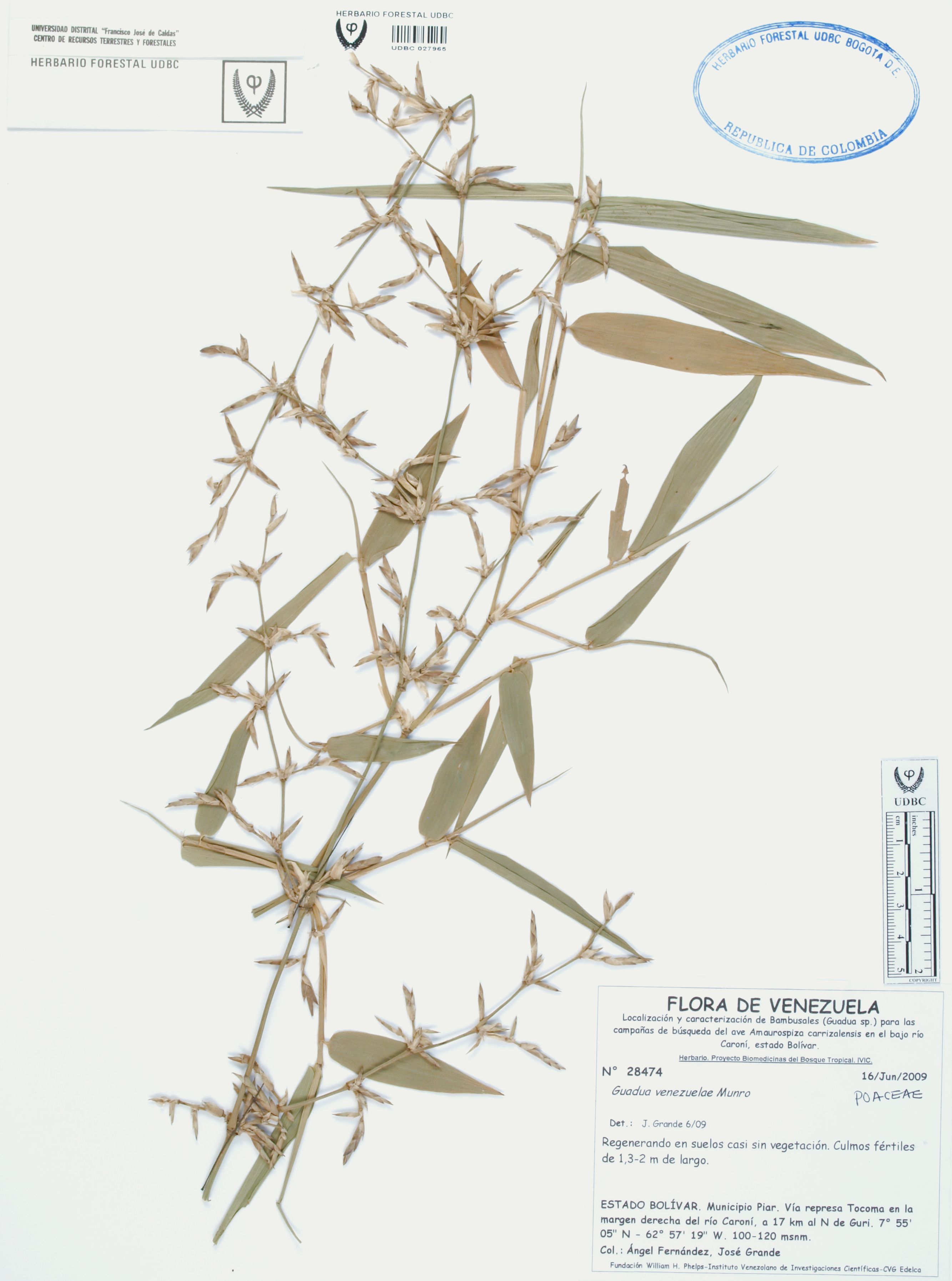Fotografía del ejemplar Fernández, A. 28474, determinado como Guadua venezuelae en el año 2009