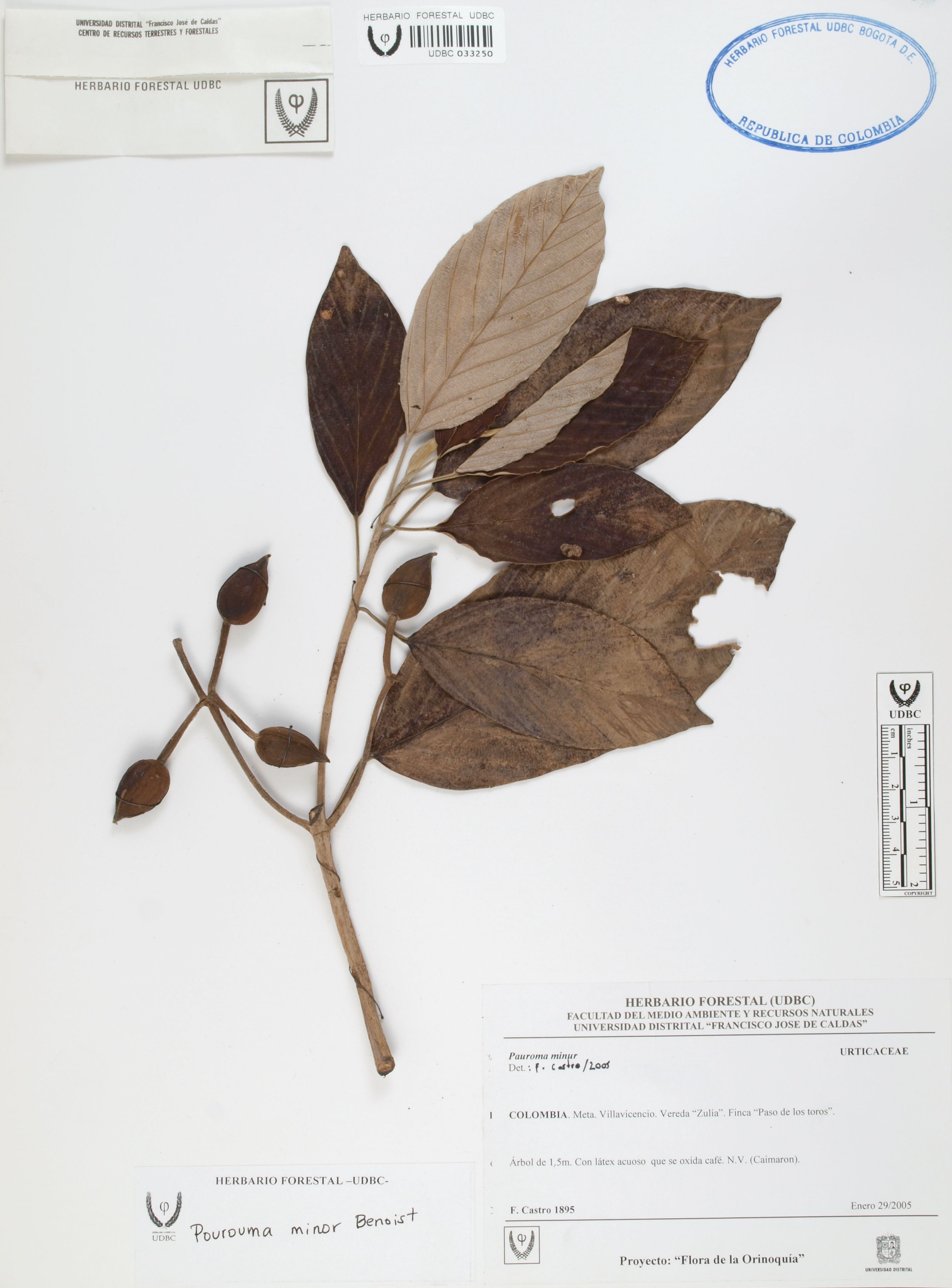Fotografía del ejemplar Castro, F. 1895, determinado como Pourouma minor en el año 2005