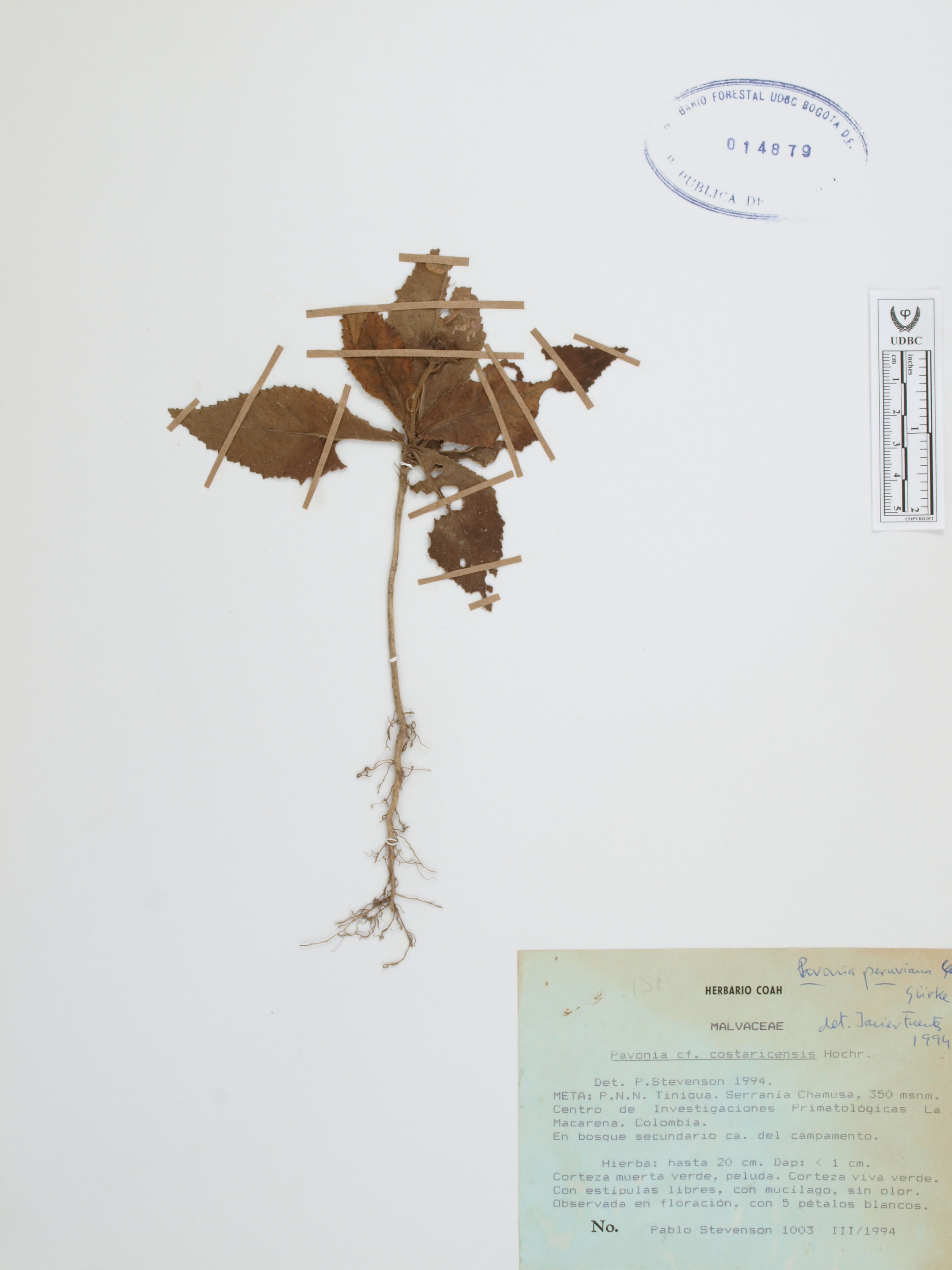 Fotografía del ejemplar Stevenson, P. 1003, determinado como Pavonia peruviana en el año 1994