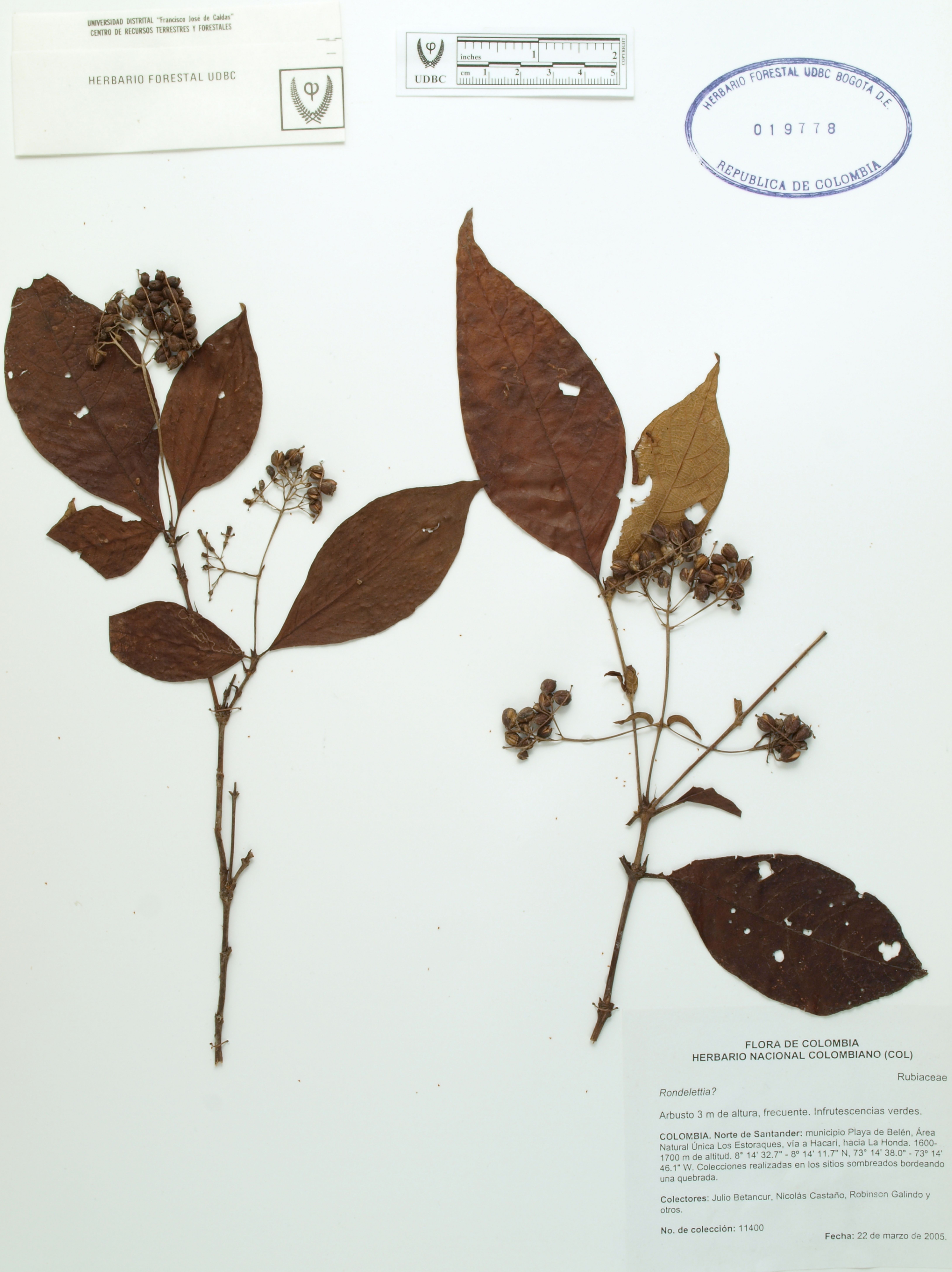 Fotografía del ejemplar Betancur, J. 11400, determinado como Rondeletia sp.