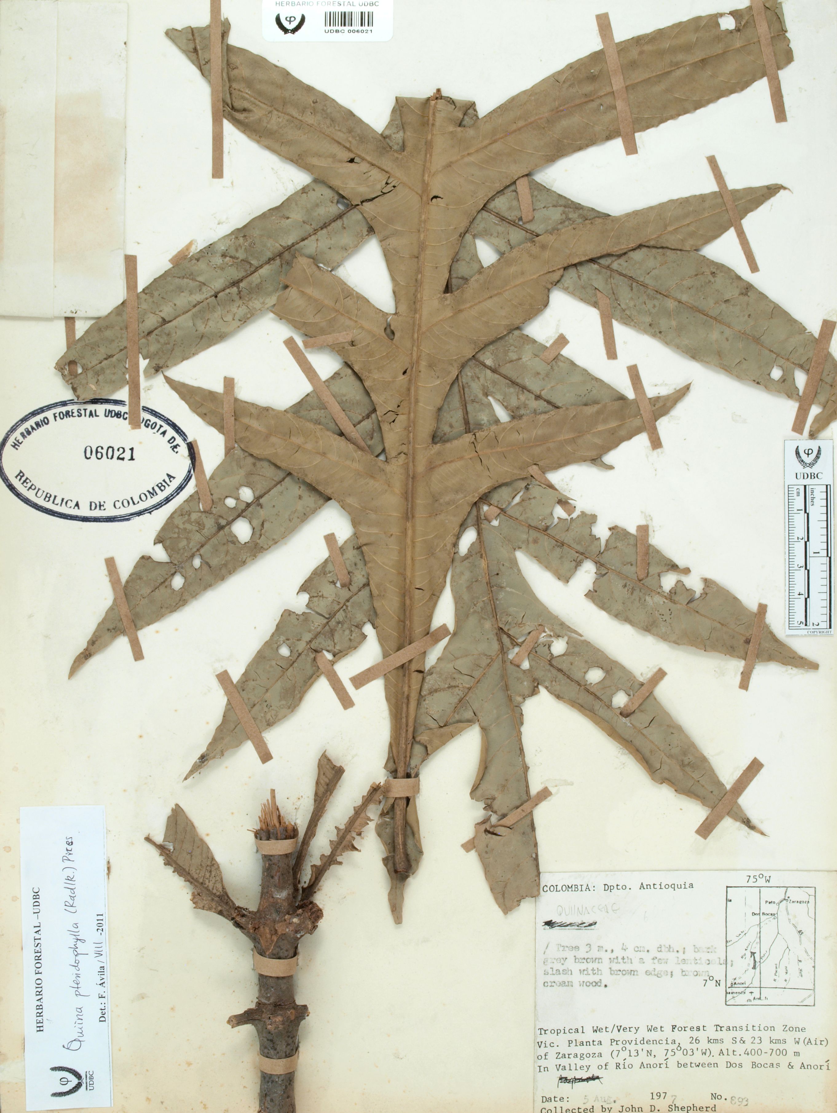 Fotografía del ejemplar Shepherd, J. 893, determinado como Quiina pteridophylla en el año 2011