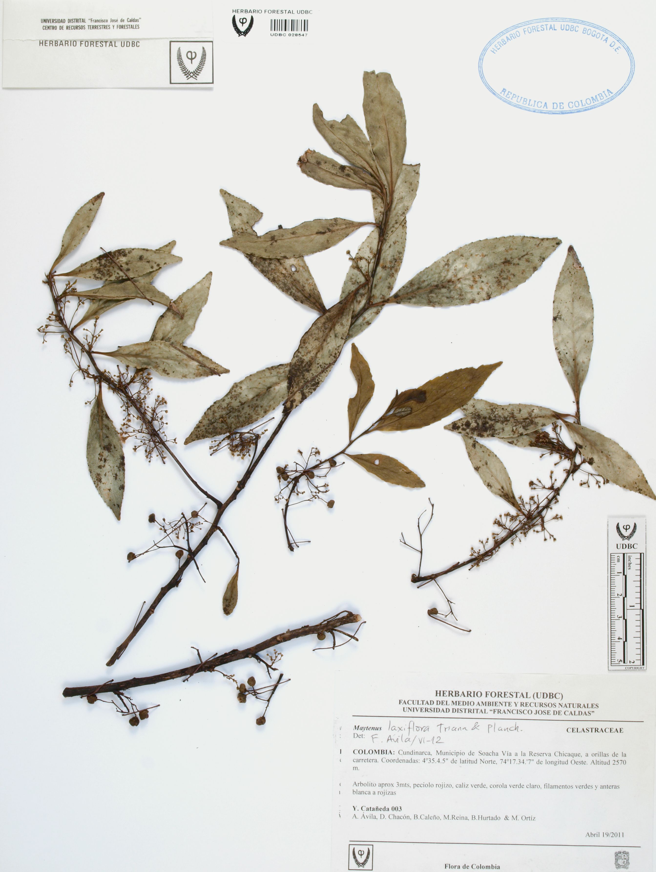 Fotografía del ejemplar Castañeda, Y. 3, determinado como Maytenus laxiflora en el año 2012