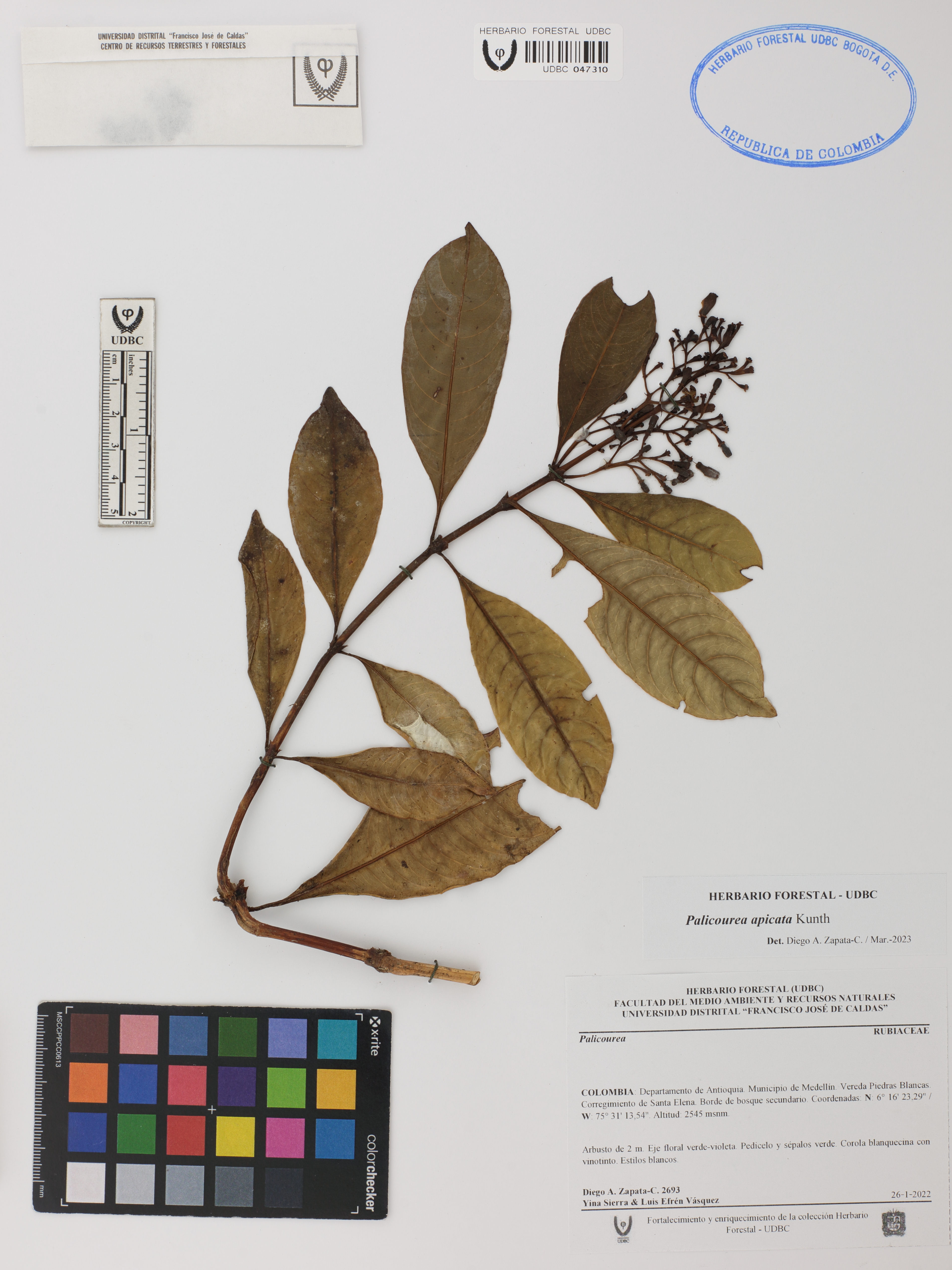 Fotografía del ejemplar Zapata-C., D. 2693, determinado como Palicourea apicata en el año 2023