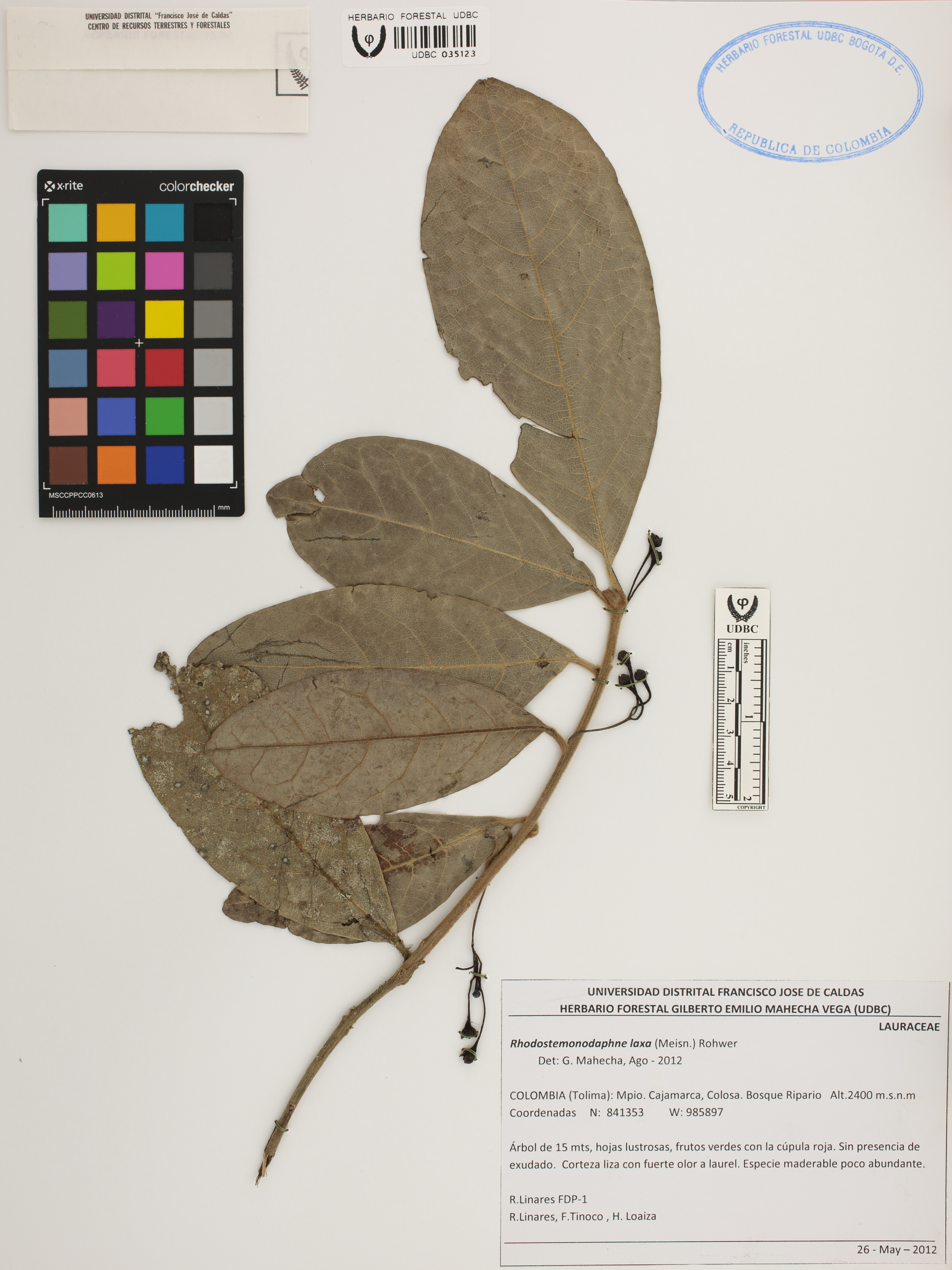 Fotografía del ejemplar Linares, R. 1, determinado como Rhodostemonodaphne laxa en el año 2012