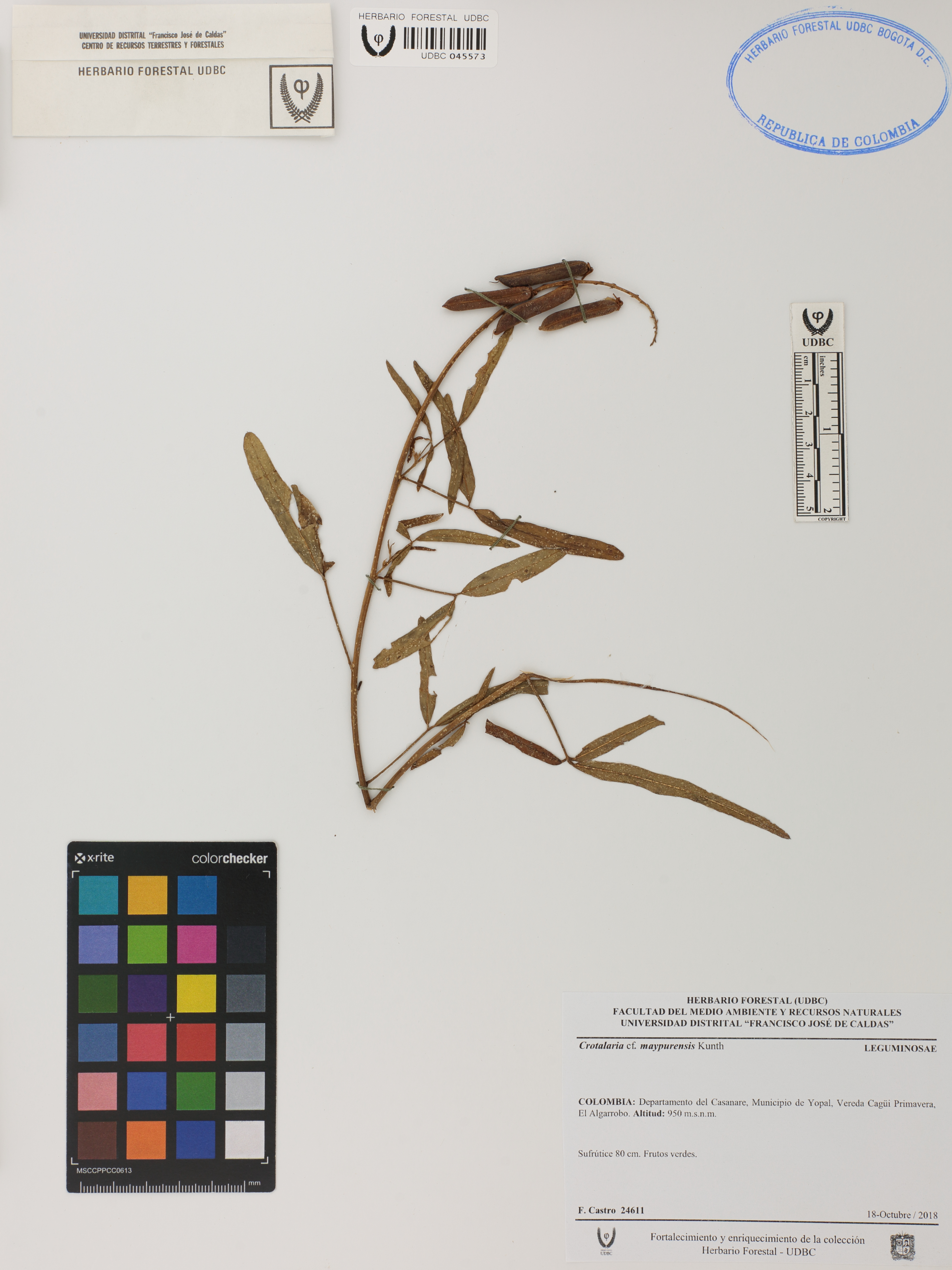 Fotografía del ejemplar Castro, F. 24611, determinado como Crotalaria maypurensis en el año 2018