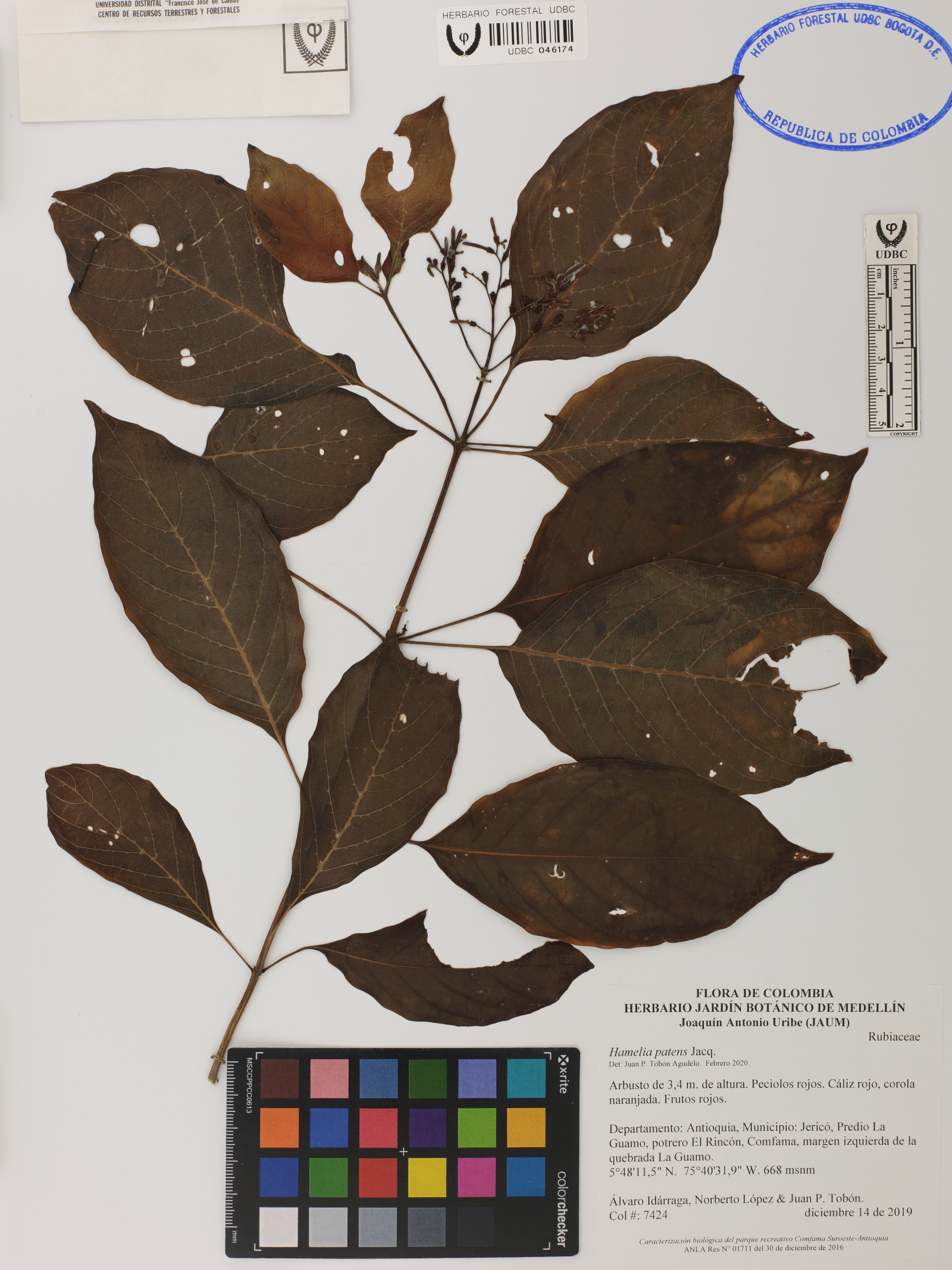 Fotografía del ejemplar Idárraga, Á. 7424, determinado como Hamelia patens en el año 2020