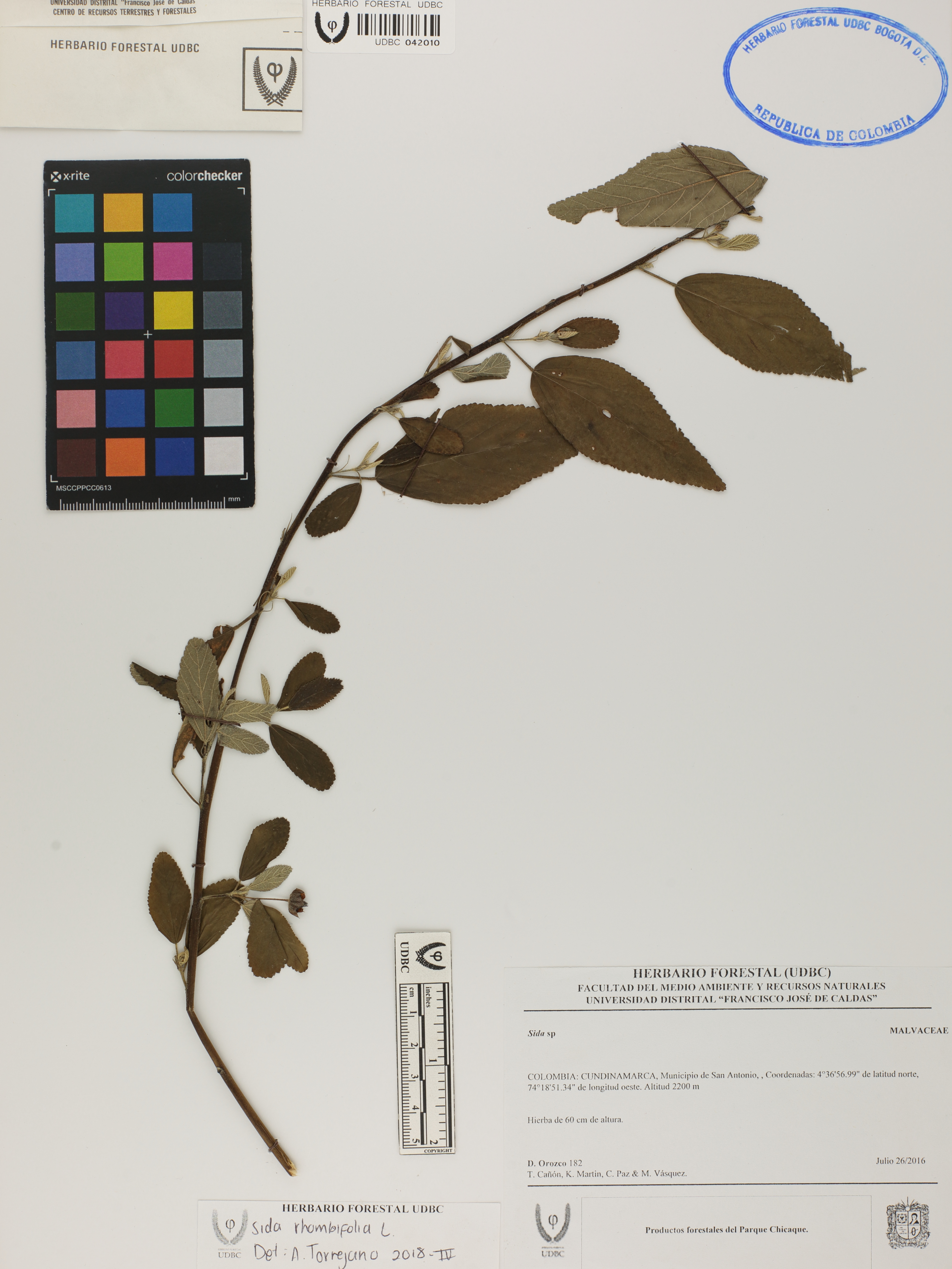 Fotografía del ejemplar Orozco, D. 182, determinado como Sida rhombifolia en el año 2018