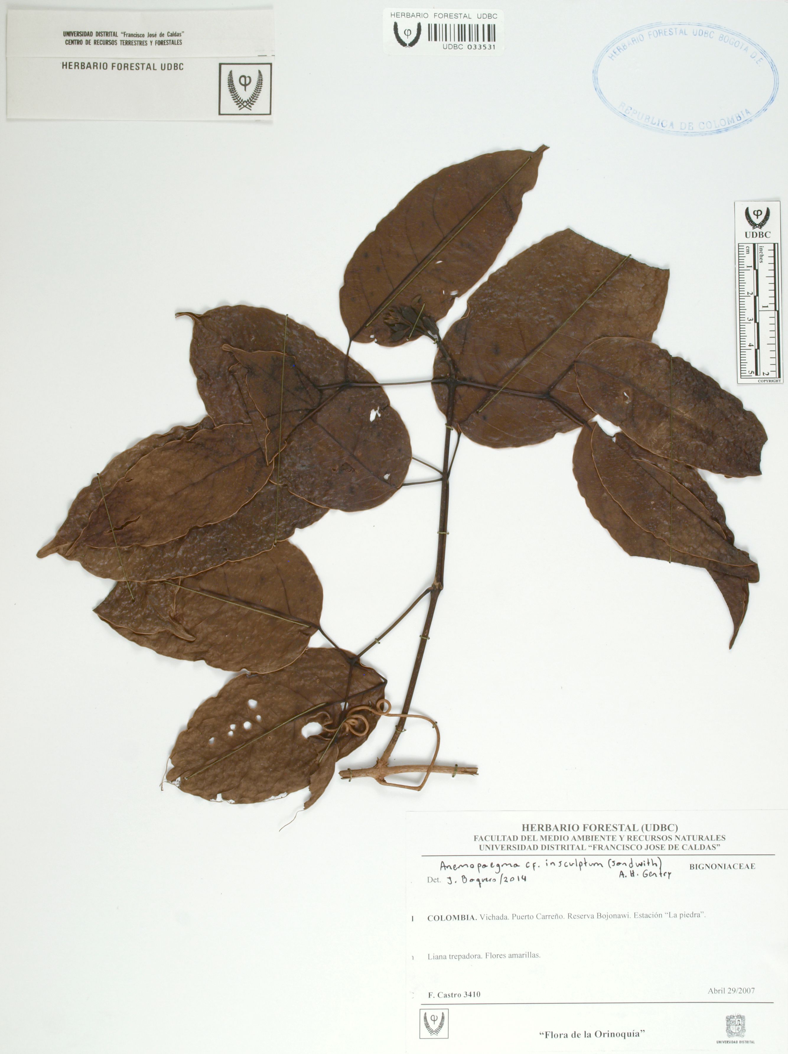 Fotografía del ejemplar Castro, F. 3410, determinado como Anemopaegma insculptum en el año 2014