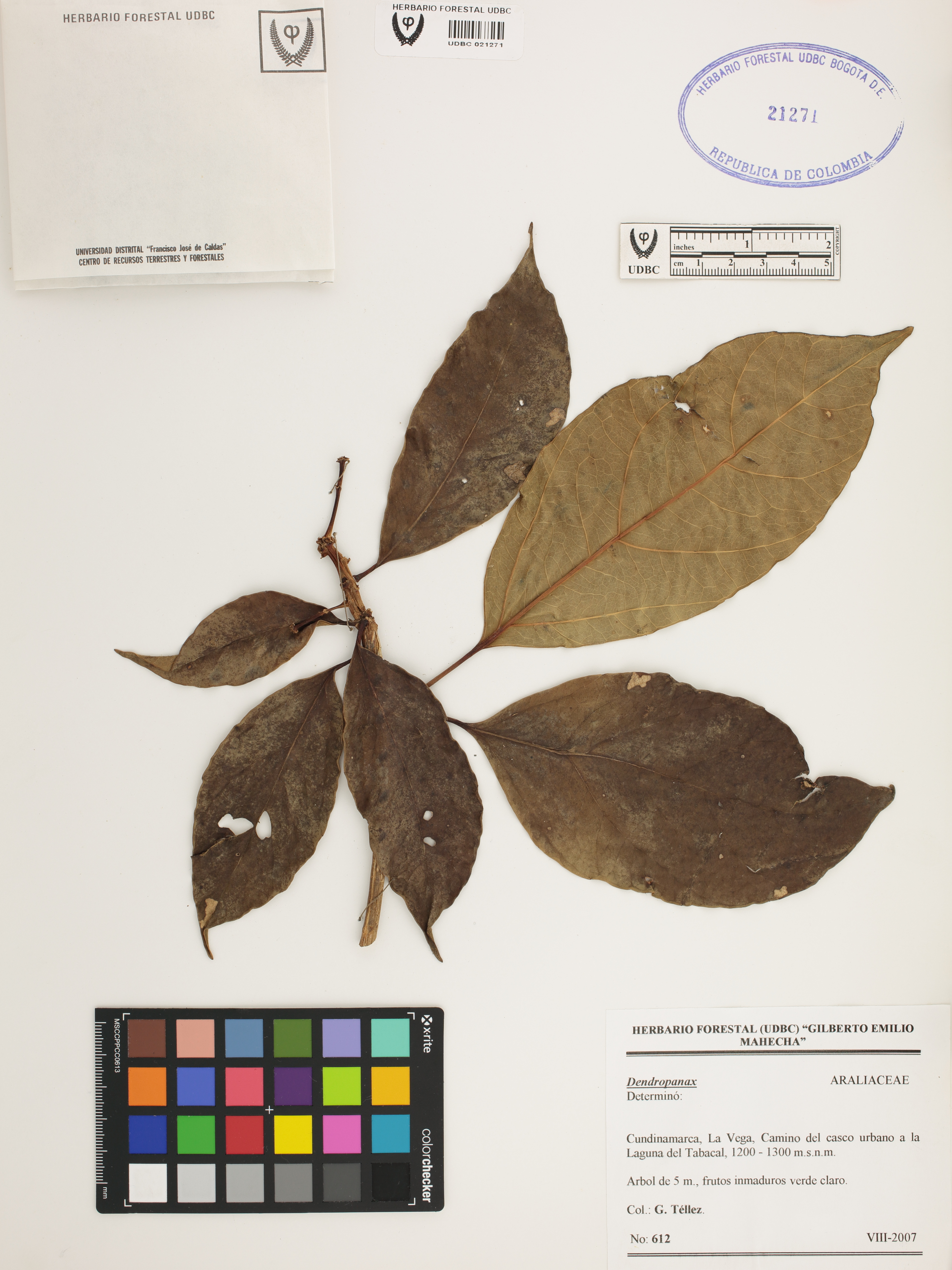 | dc.description | Fotografía del ejemplar Téllez, G. 612, determinado como Dendropanax sp. | |