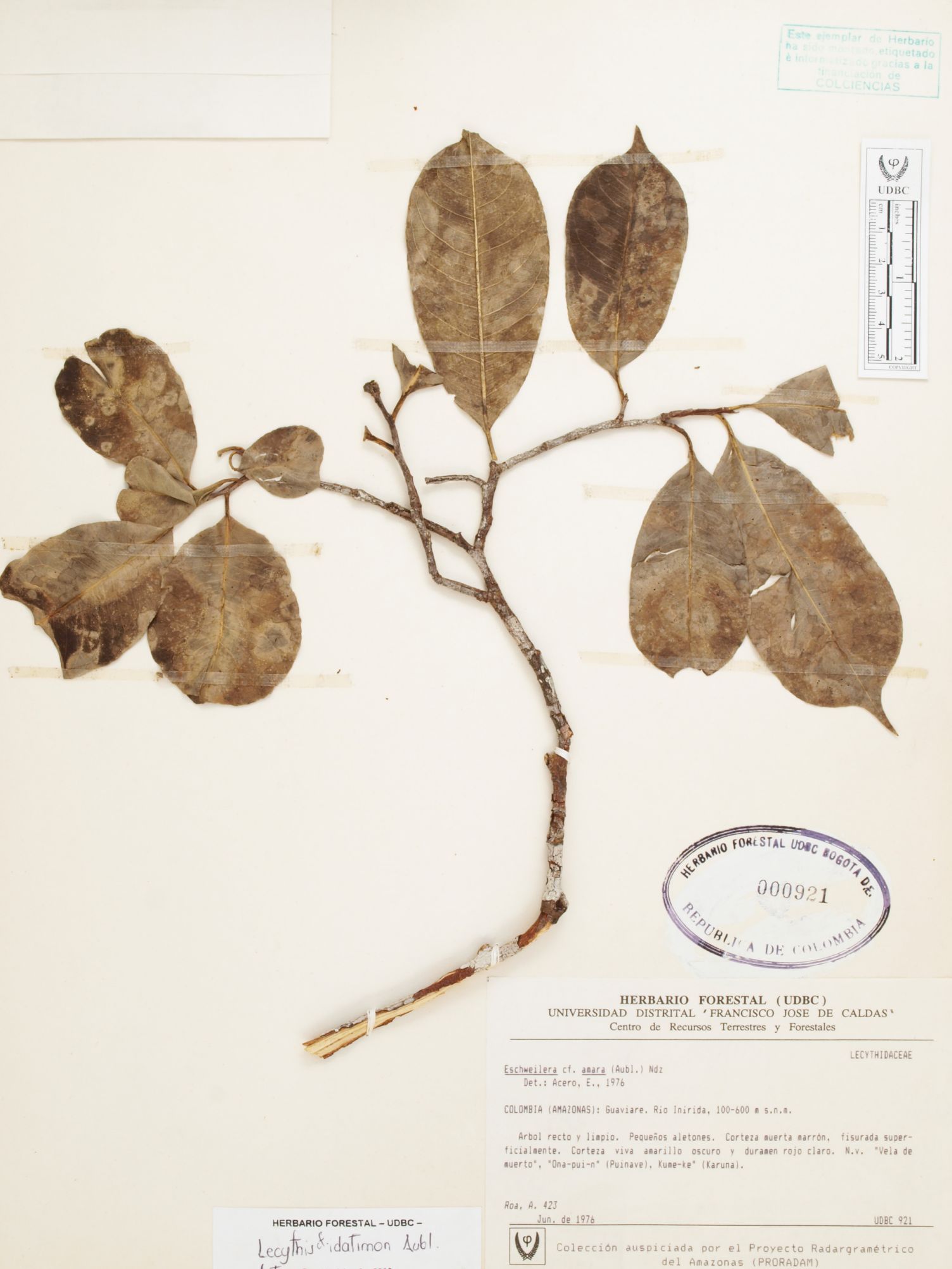 Fotografía del ejemplar Roa, A. 423, determinado como Lecythis idatimon en el año 2004