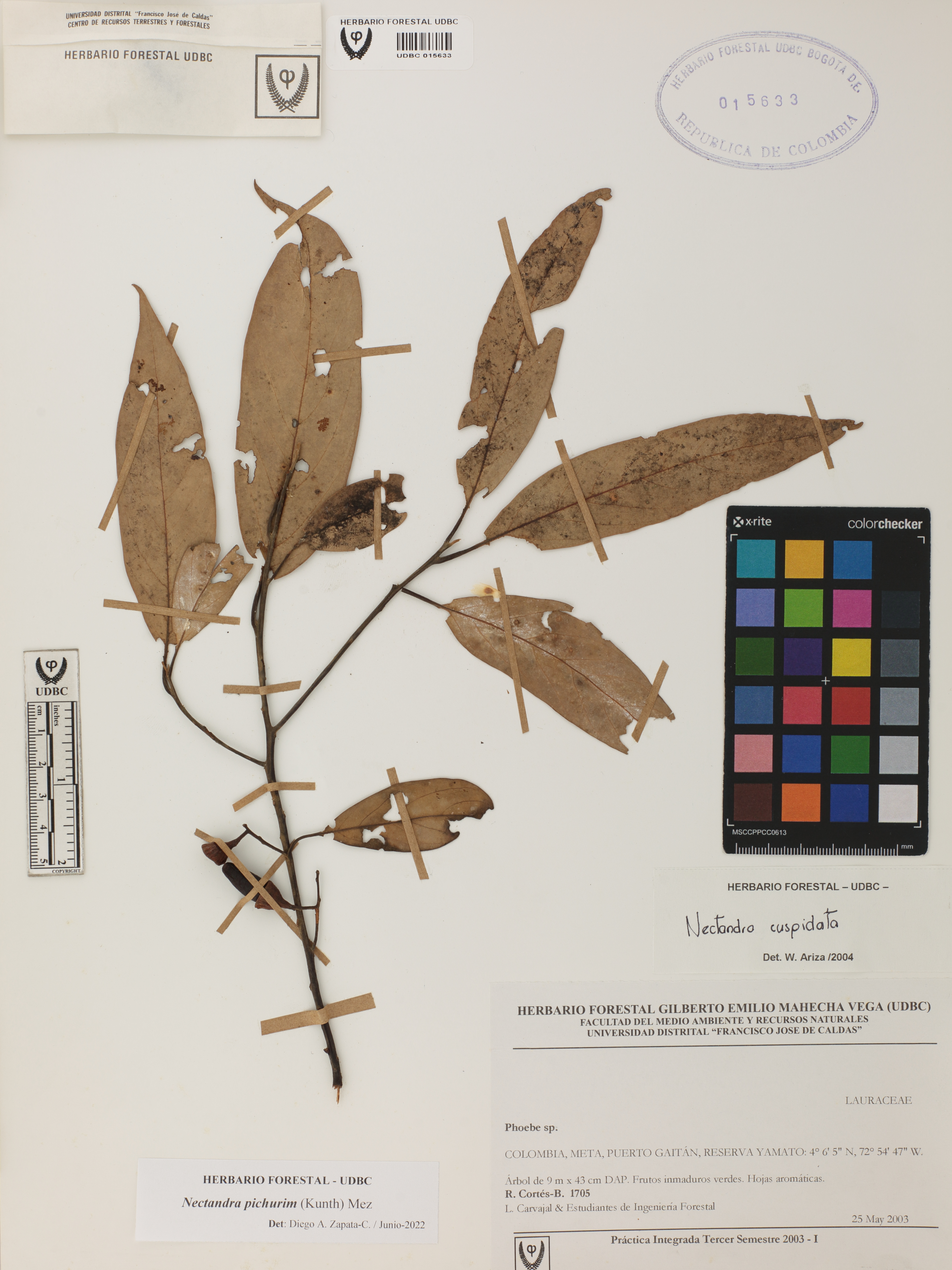 Fotografía del ejemplar Cortés-B., R. 1705, determinado como Nectandra pichurim en el año 2022