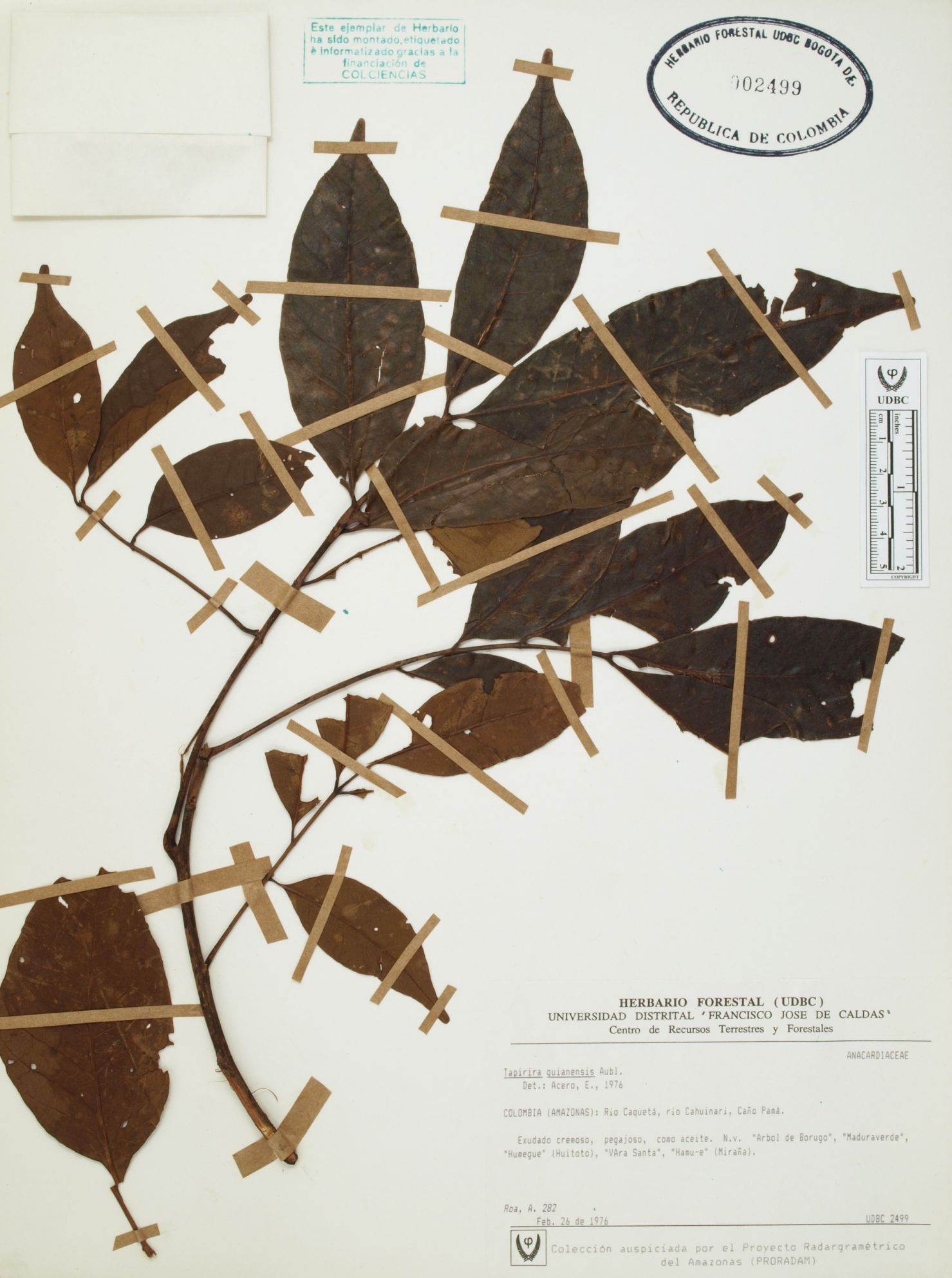 Fotografía del ejemplar Roa, A. 282, determinado como Tapirira guianensis en el año 1976