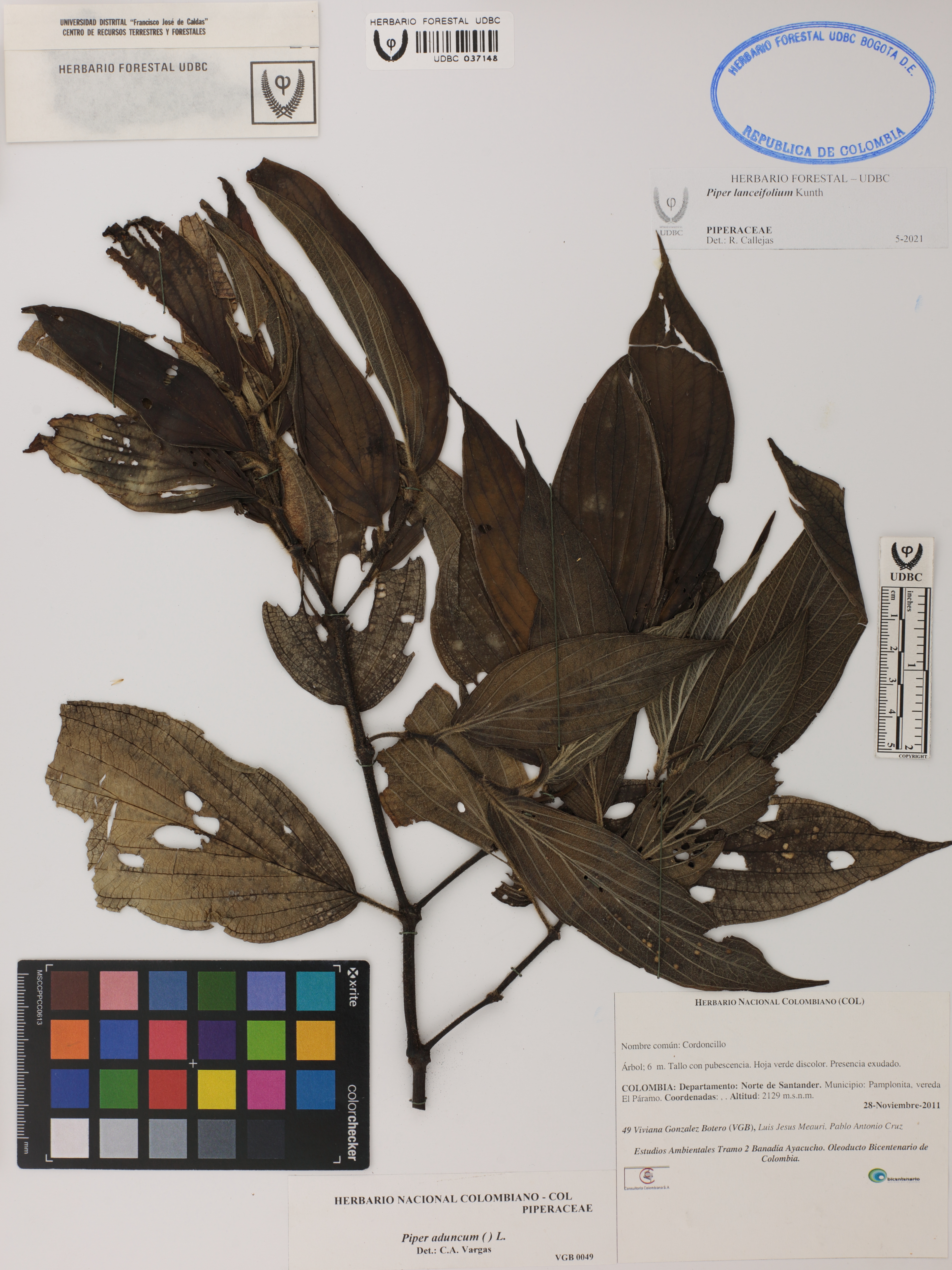 Fotografía del ejemplar González, V. 49, determinado como Piper lanceifolium en el año 2021