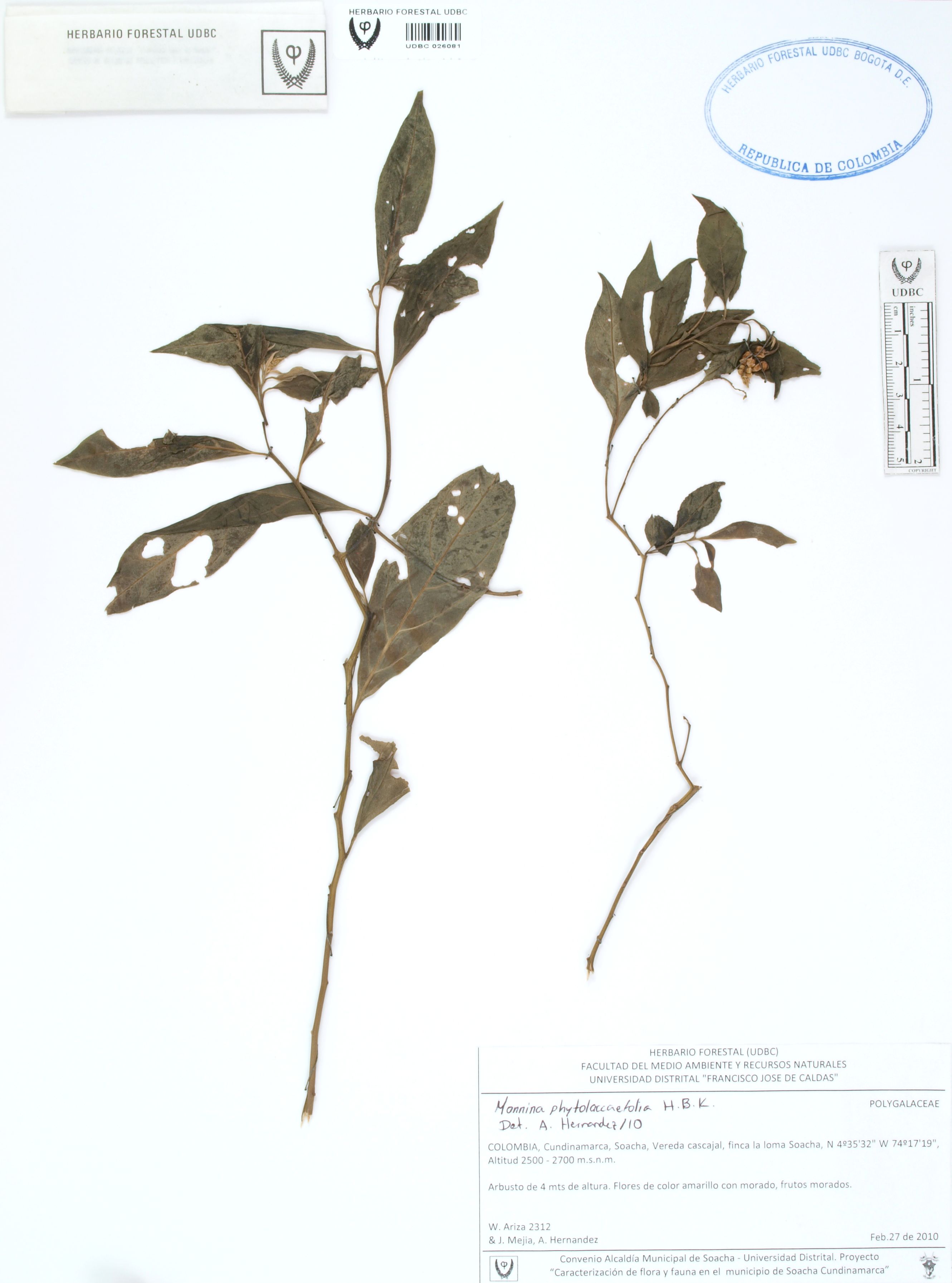 | dc.description | Fotografía del ejemplar Ariza, W. 2312, determinado como Monnina phytolaccifolia en el año 2010 | |