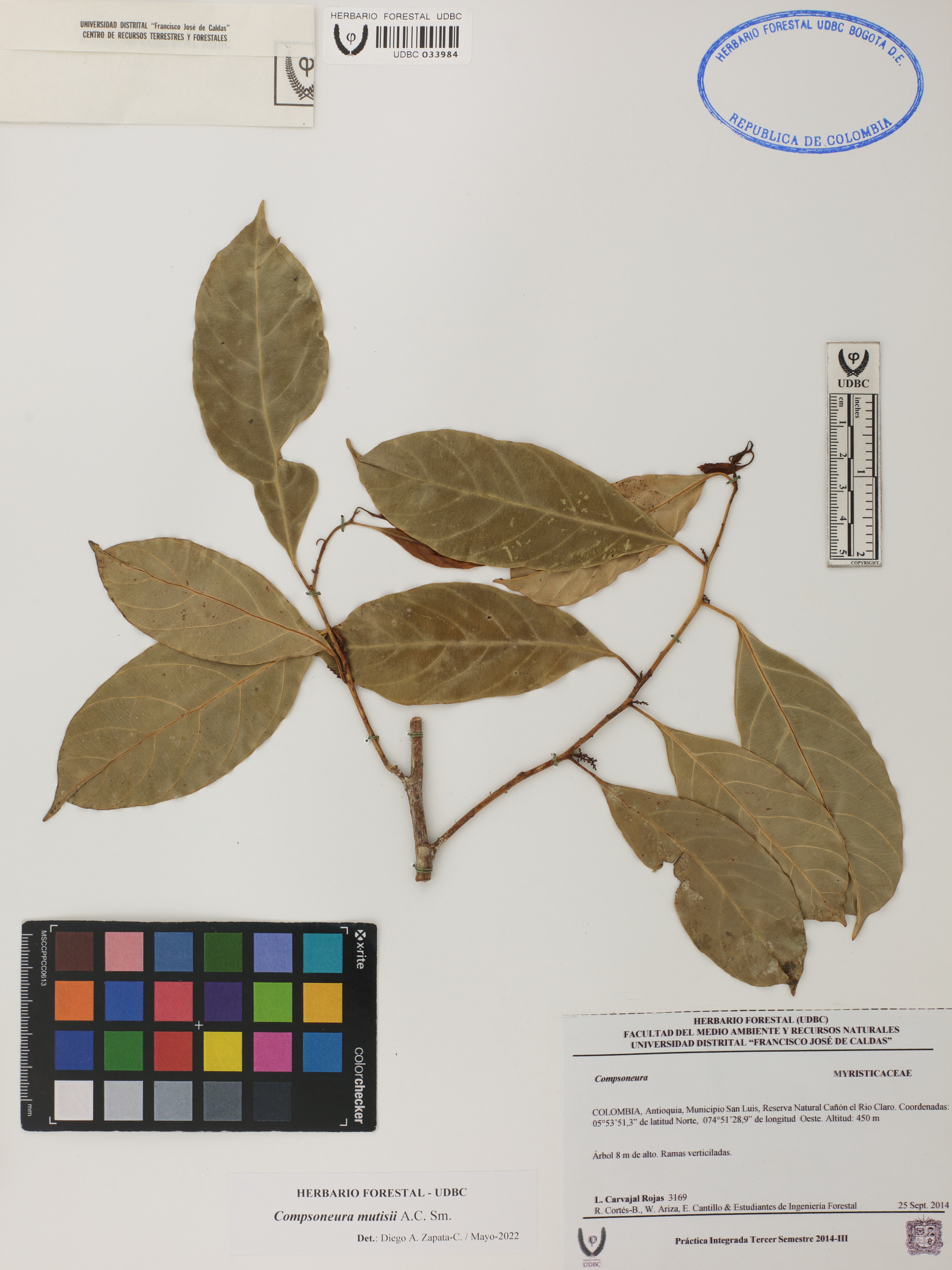 Fotografía del ejemplar Carvajal, L. 3169, determinado como Compsoneura mutisii en el año 2022