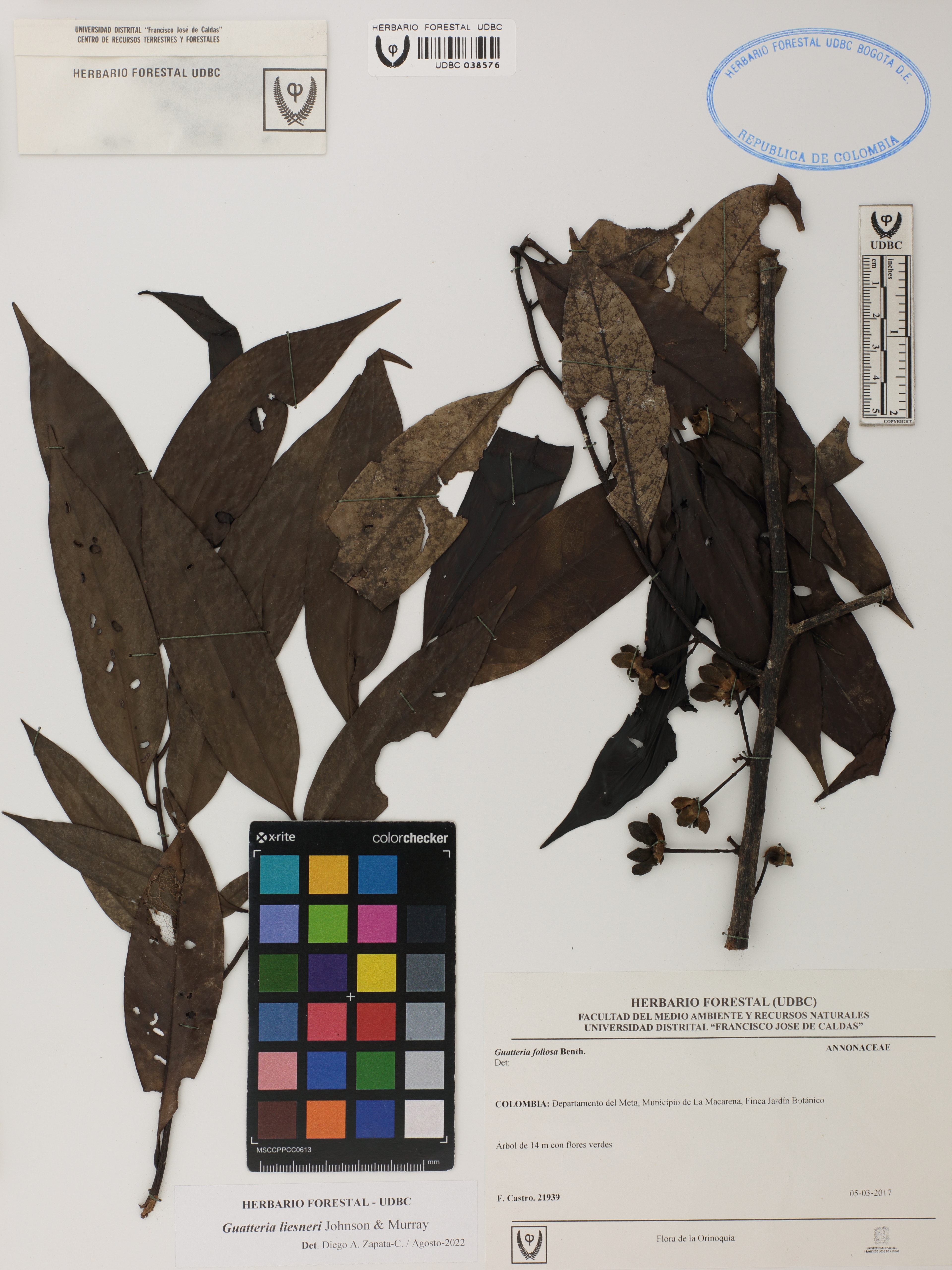 Fotografía del ejemplar Castro, F. 21939, determinado como Guatteria liesneri en el año 2022