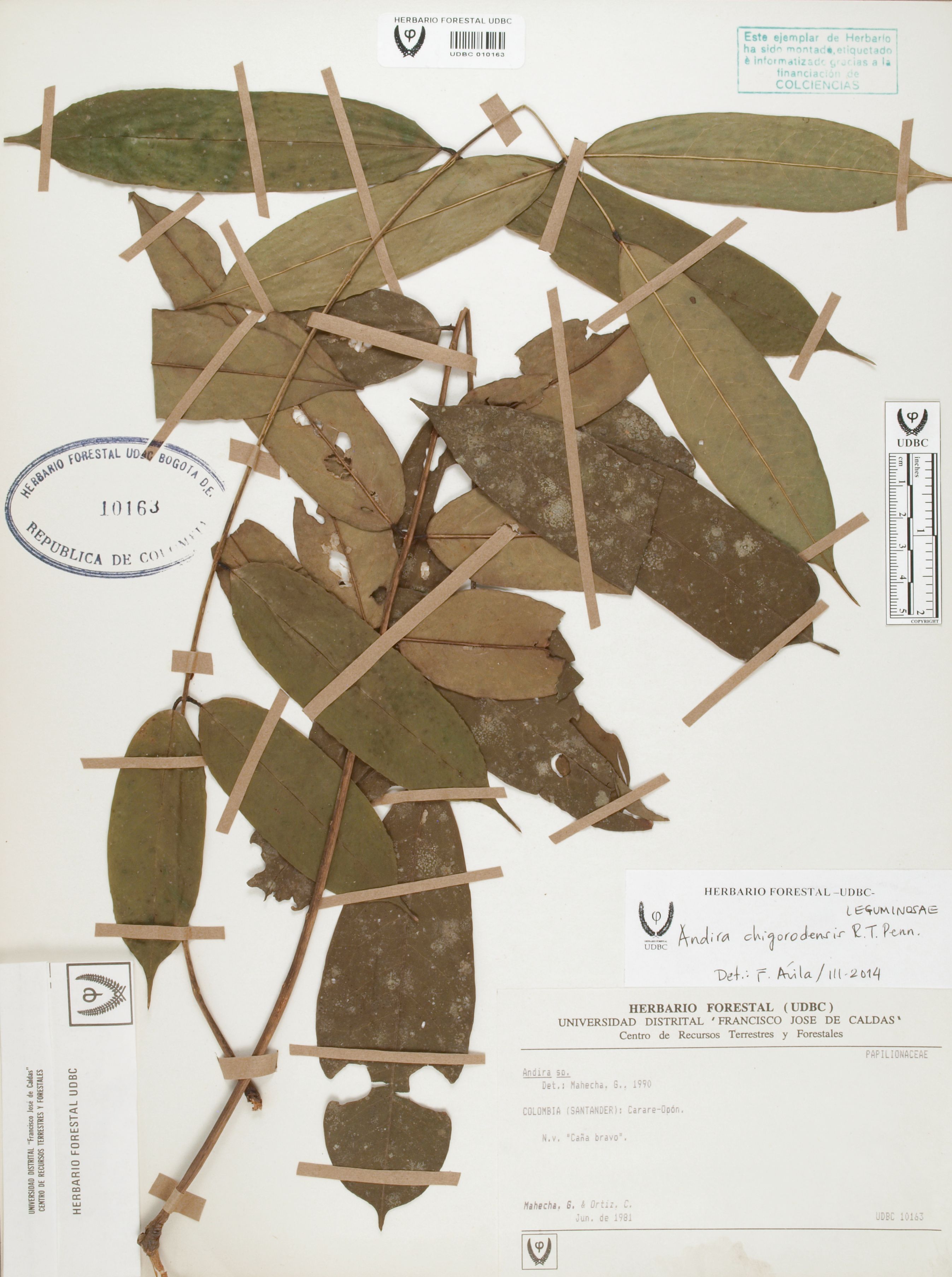 Fotografía del ejemplar Mahecha, G., determinado como Andira chigorodensis en el año 2014