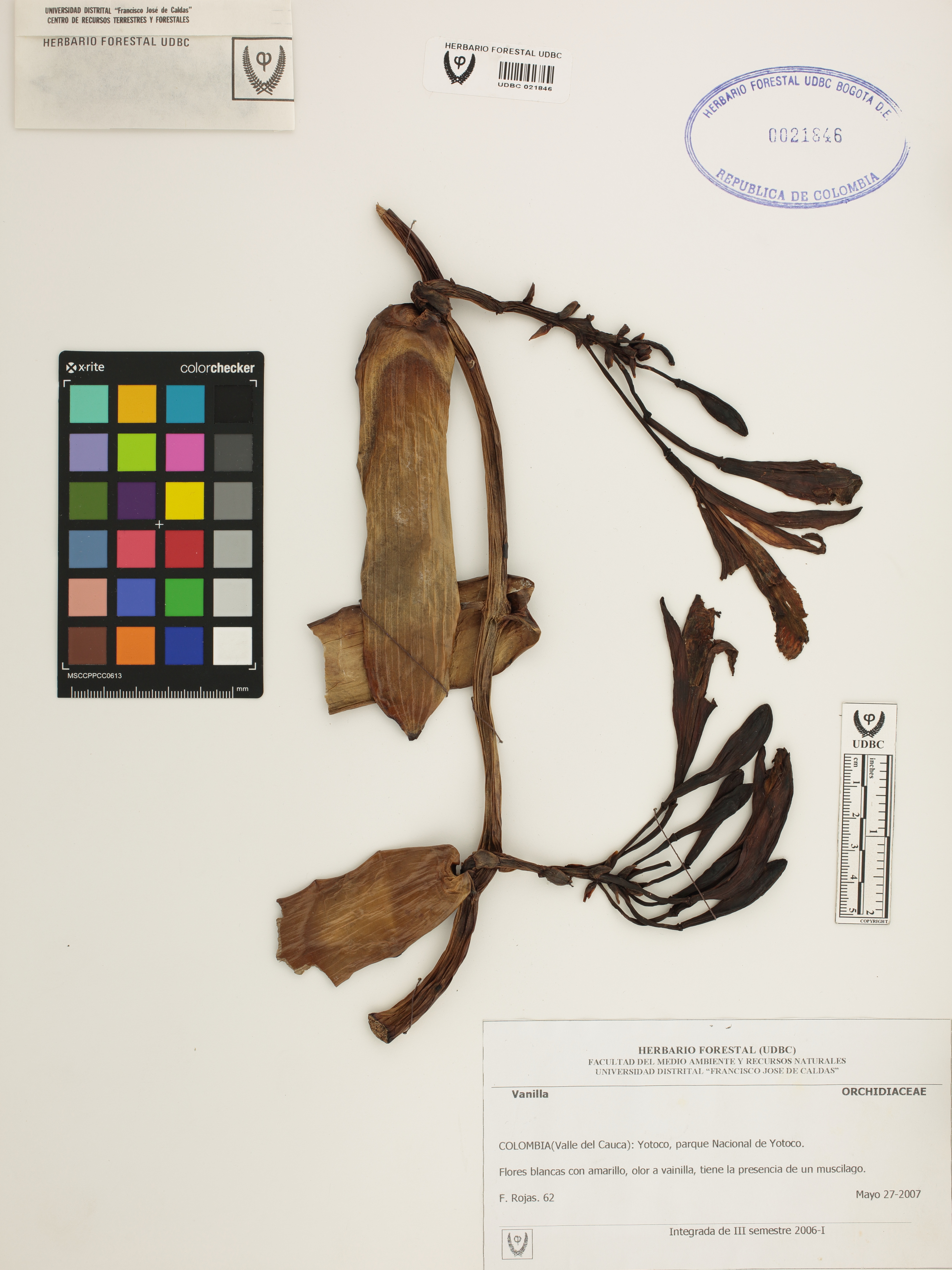 Fotografía del ejemplar Rojas, F. 62, determinado como Vanilla calyculata en el año 2024