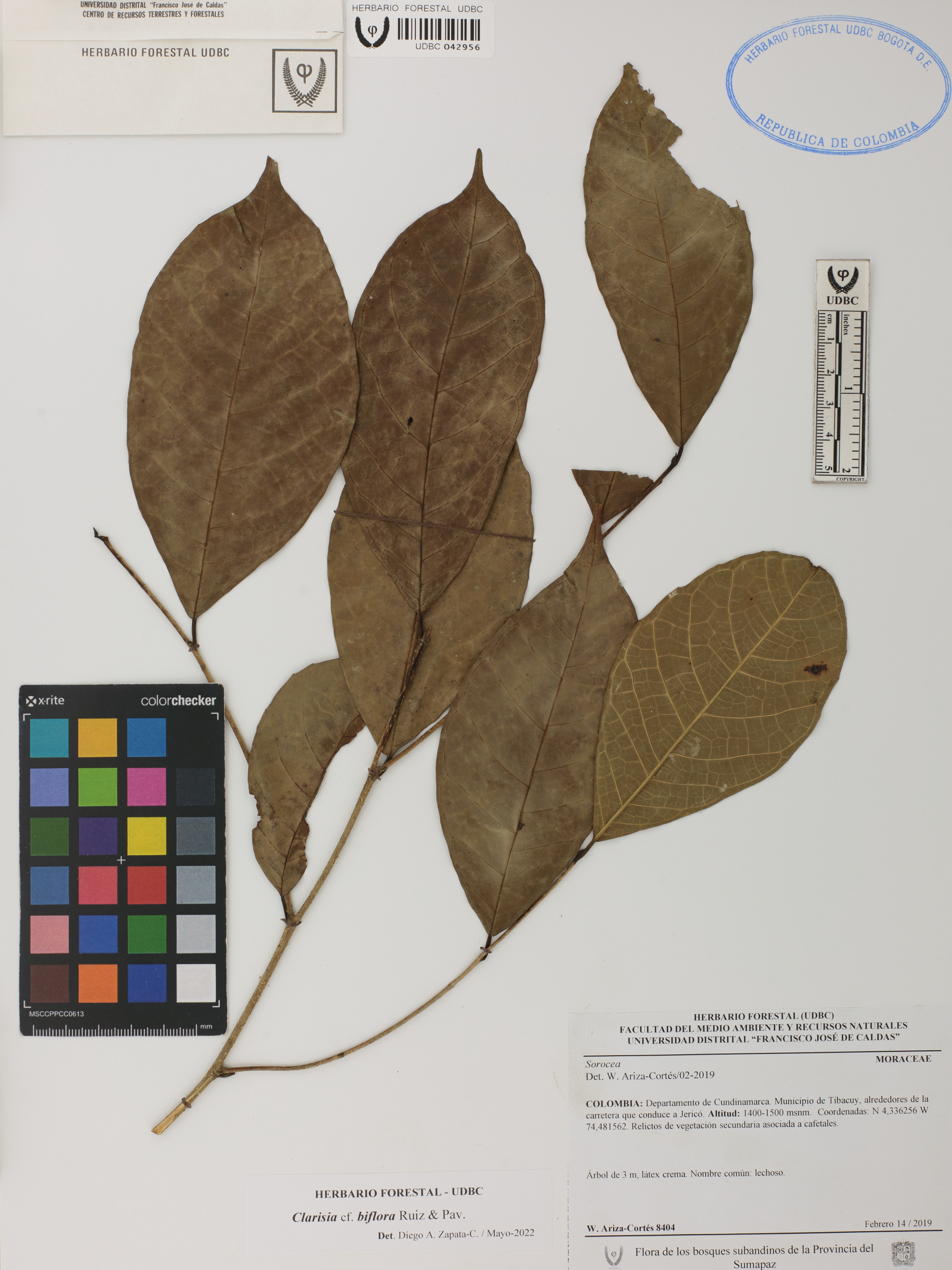 Fotografía del ejemplar Ariza-Cortés, W. 8404, determinado como Clarisia biflora en el año 2022