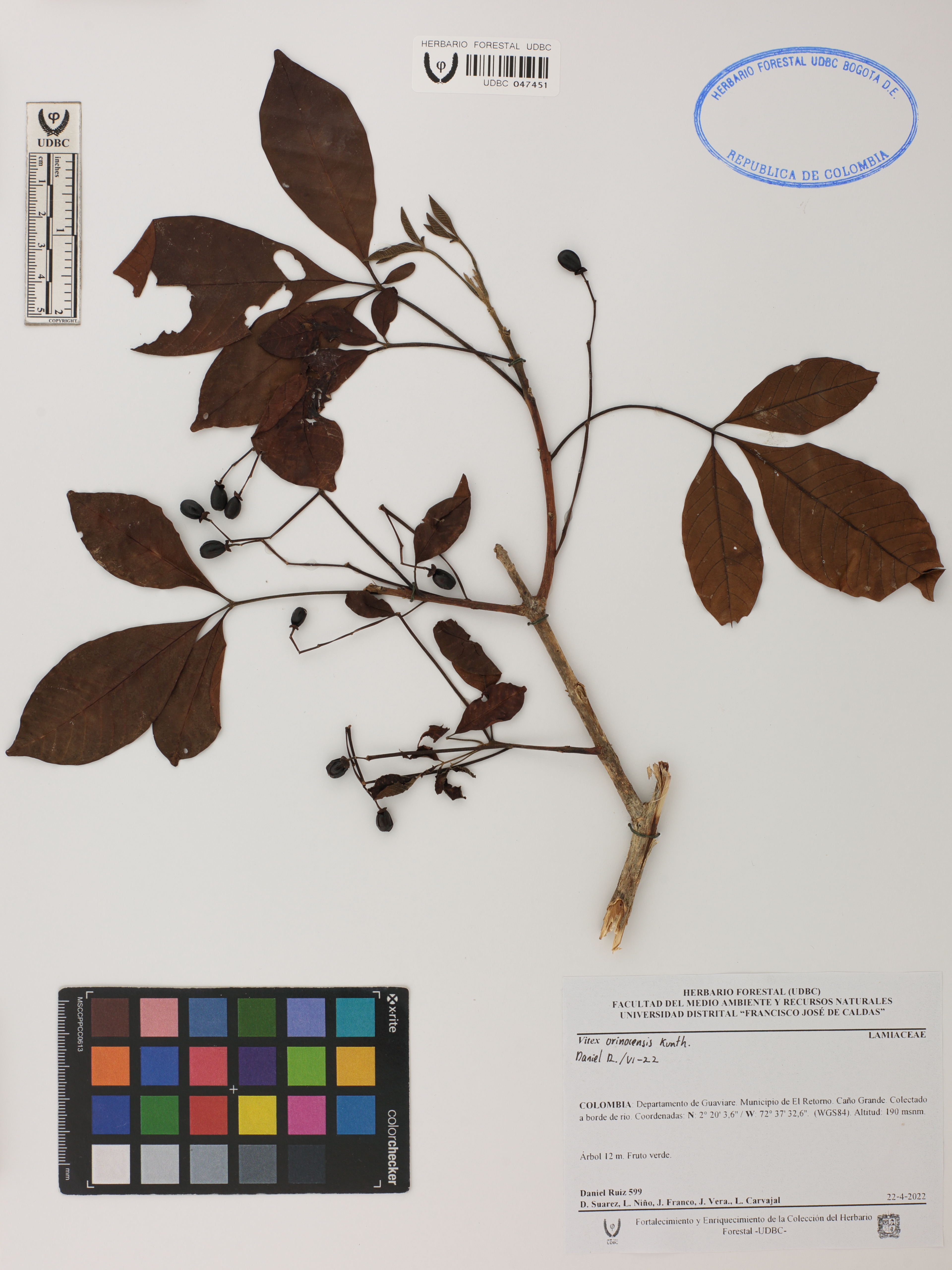 Fotografía del ejemplar Ruiz, Daniel 599, determinado como Vitex orinocensis en el año 2022