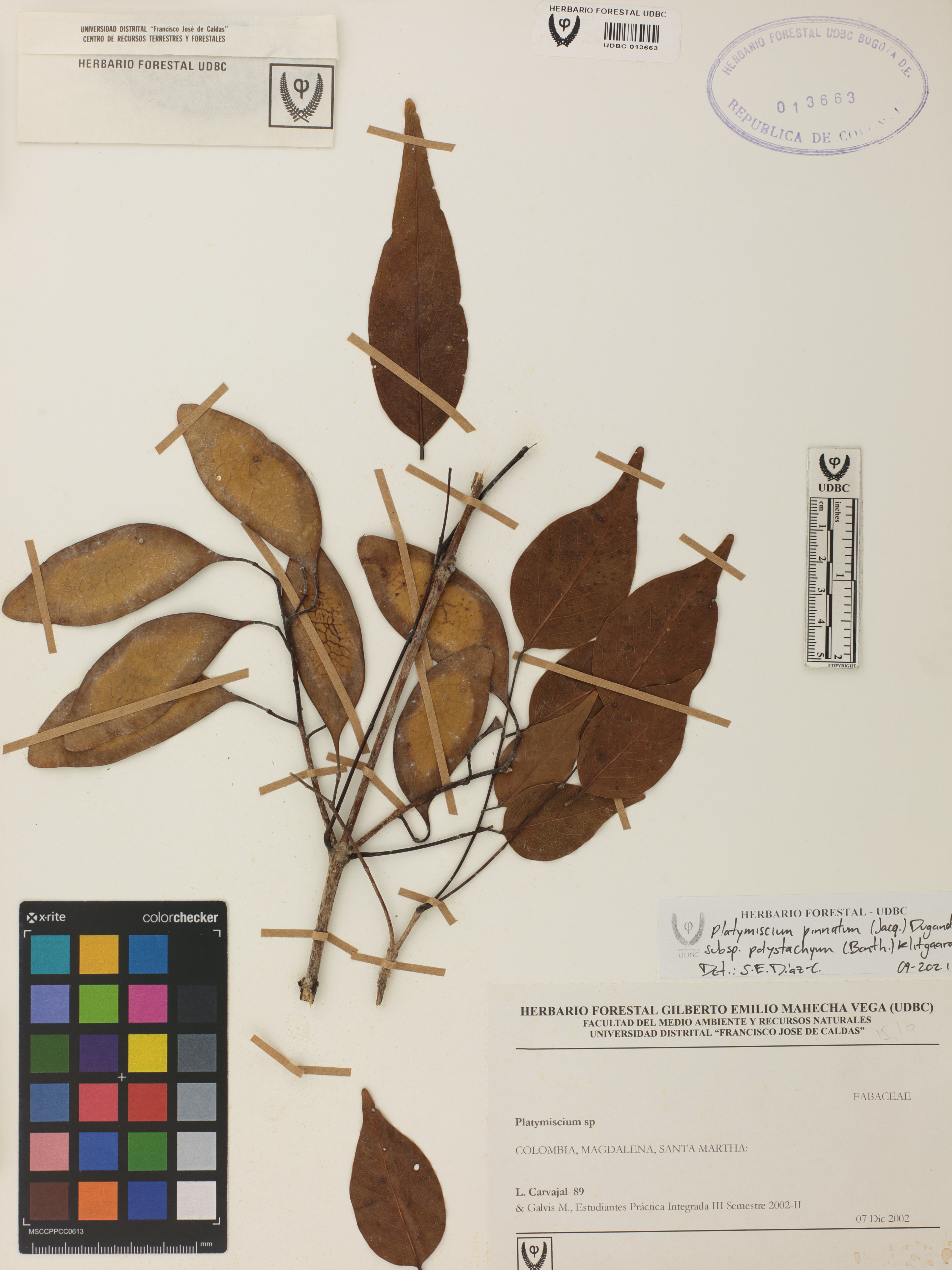 Fotografía del ejemplar Carvajal, L. 89, determinado como Platymiscium pinnatum subsp. polystachyum en el año 2021
