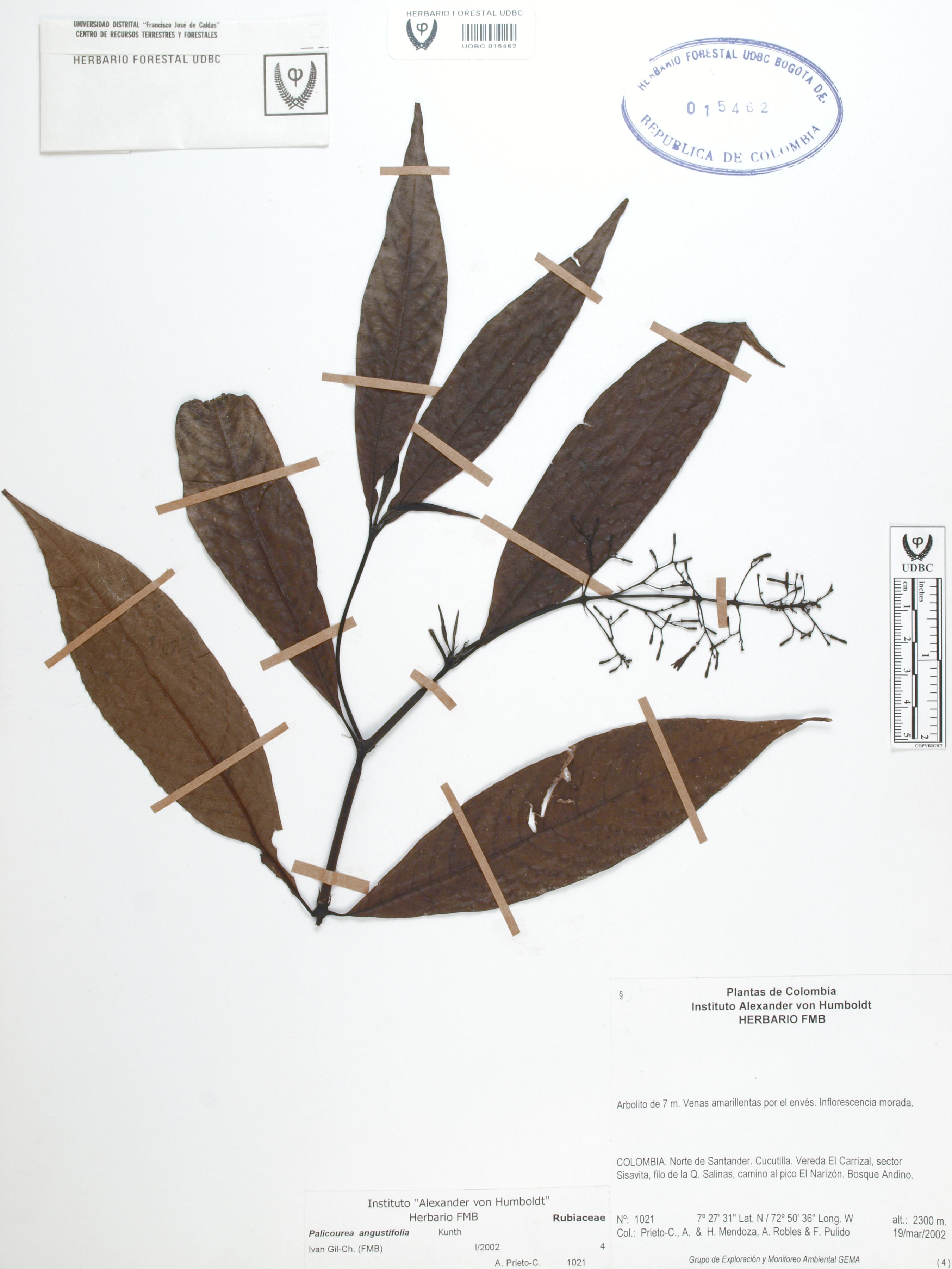 Fotografía del ejemplar Prieto-C., A. 1021, determinado como Palicourea angustifolia en el año 2002