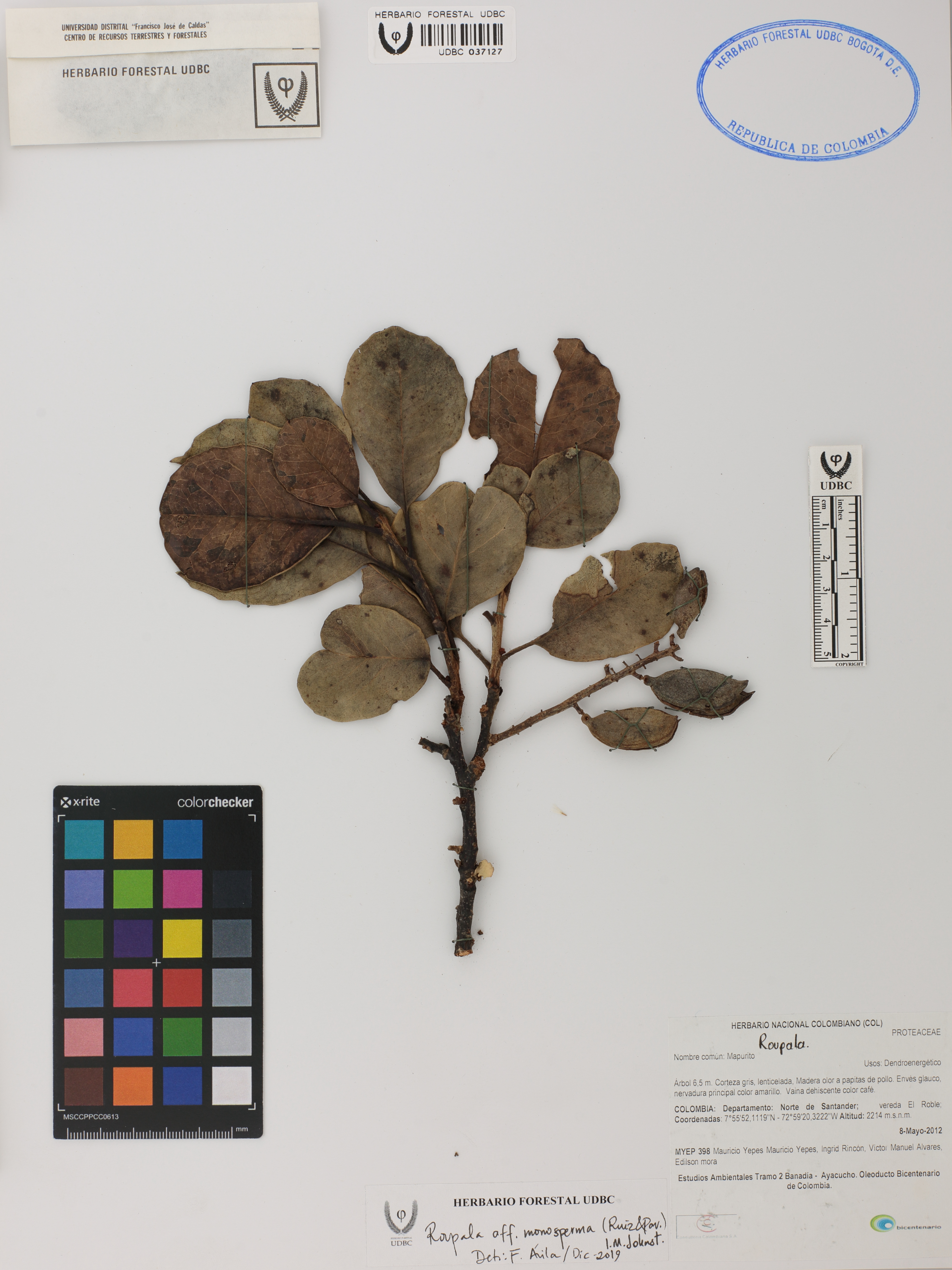 Fotografía del ejemplar Yepes, M. 398, determinado como Roupala monosperma en el año 2019