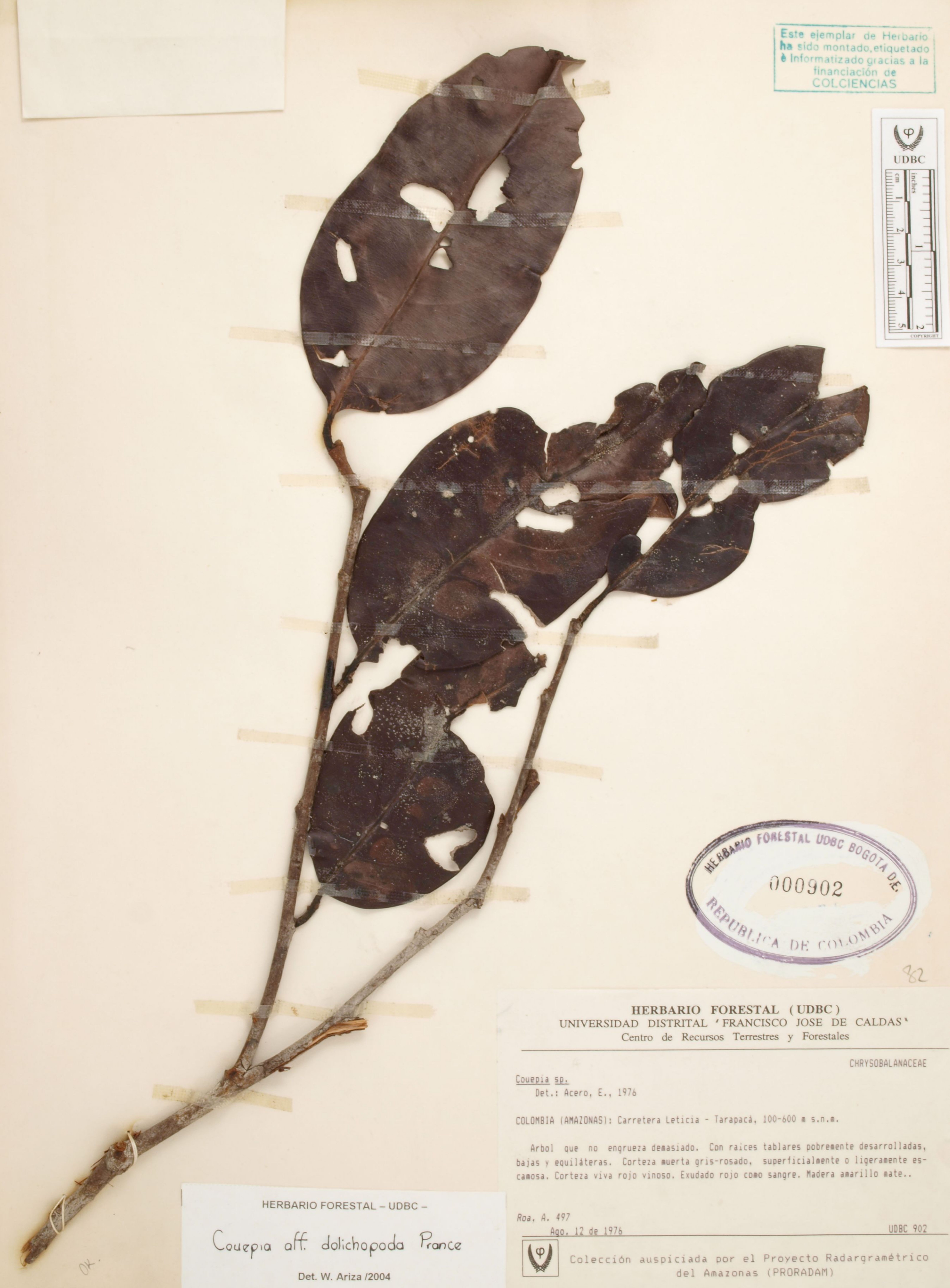 Fotografía del ejemplar Roa, A. 497, determinado como Couepia dolichopoda en el año 2004